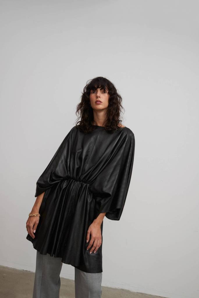 Z kolei mocno opuszczona (lub zupełnie pominięta) linia talii w sukniach typu kaftan, kimonowe rękawy, marszczenia w okolicach bioder oraz warstwowo budowane sylwetki zdają się czerpać z lat 20. Luksusowo połyskująca satyna z delikatnym deseniem posłużyła do uszycia ‚piżamowego’ garnituru, który również może nawiązywać do estetyki orientu, chętnie wykorzystywanej w tej dekadzie.