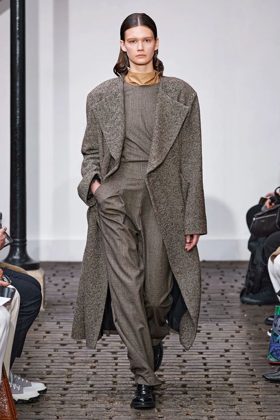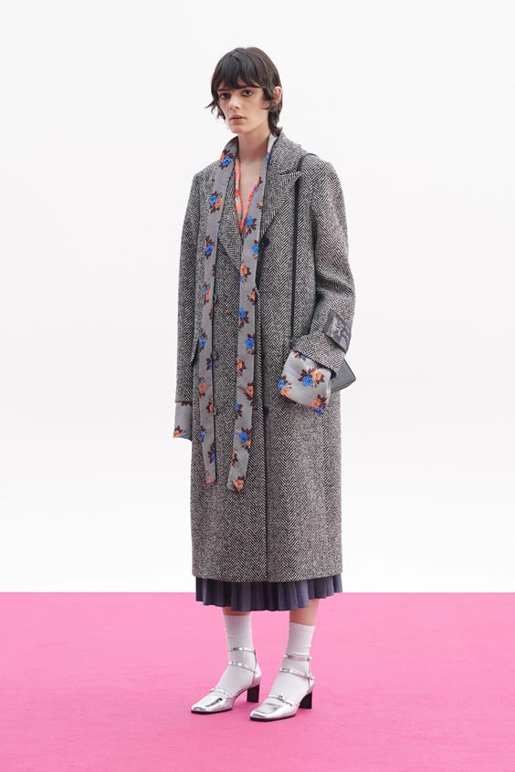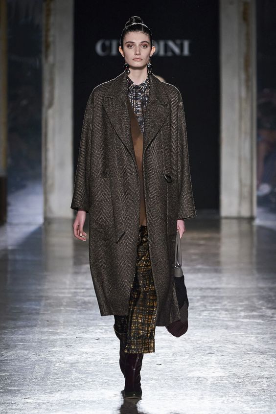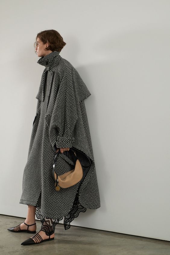 Jodełka to potoczna nazwa tkaniny wełnianej o charakterystycznym, skośnym łamanym splocie, układającym się w rządki w kształcie litery V. Może być jednokolorowa lub tkana z przędzy o różnych odcieniach. Najczęściej spotyka się jodełkę w odcieniach szarości, czerni i bieli, rzadziej brązu czy beżu. Właśnie taka kolorystyka dominowała w kolekcjach projektantów. Prosty, lekko przeskalowany krój, eleganckie klapy, długość do kolan lub tuż za, brak zbędnych ozdób i nietypowych przeszyć to gwarancja, że płaszcz przetrwa więcej nawet niż kilka sezonów.