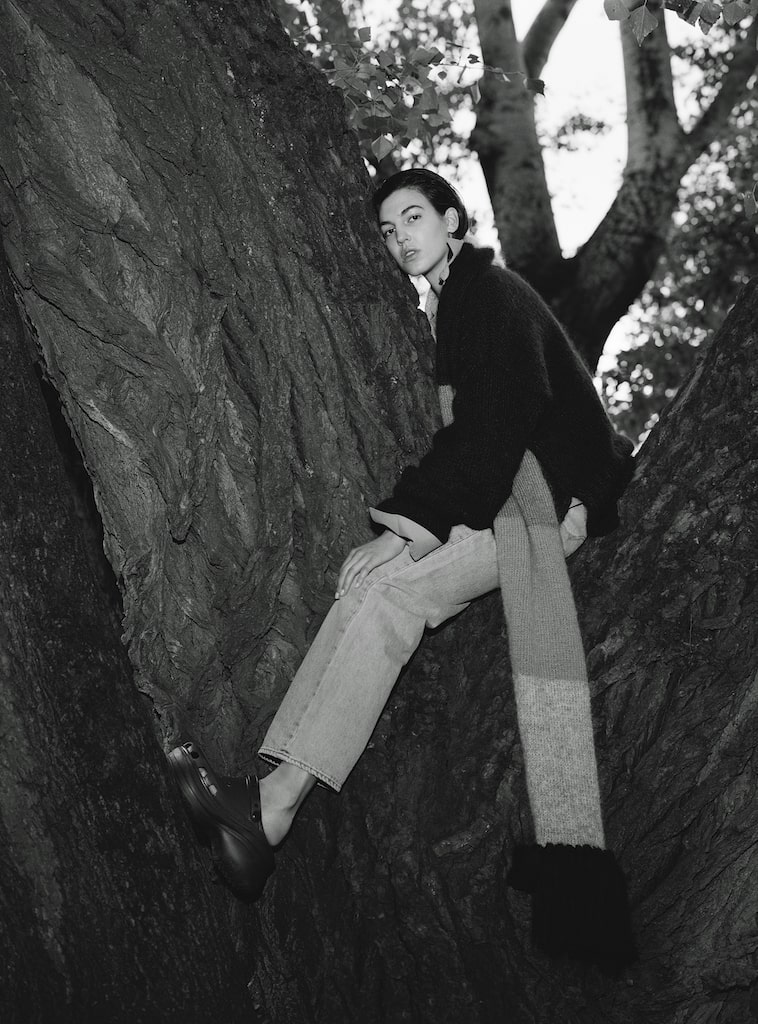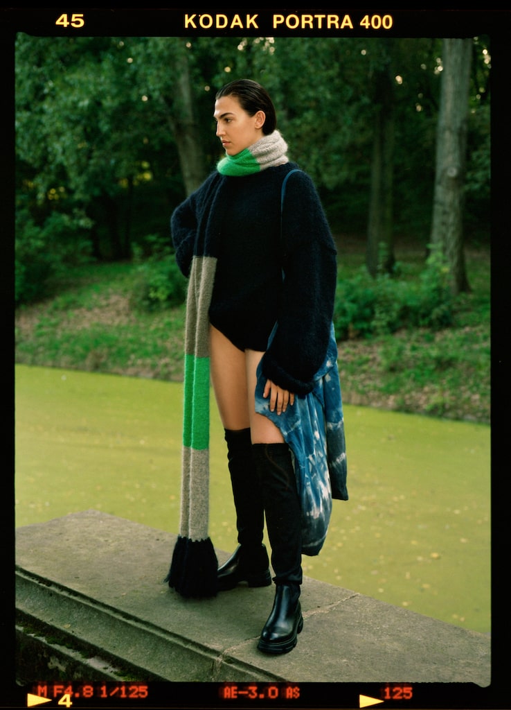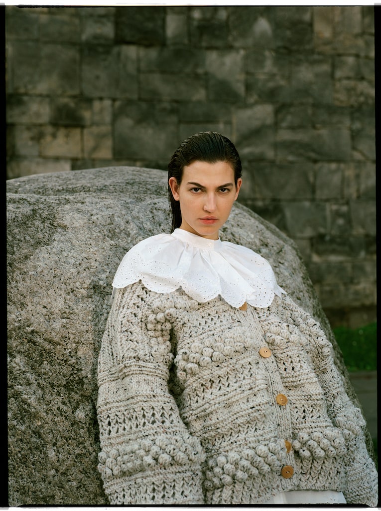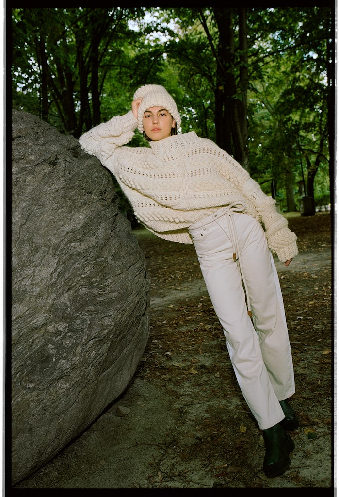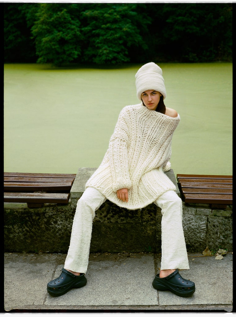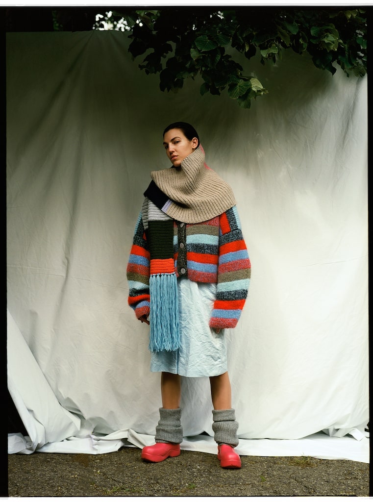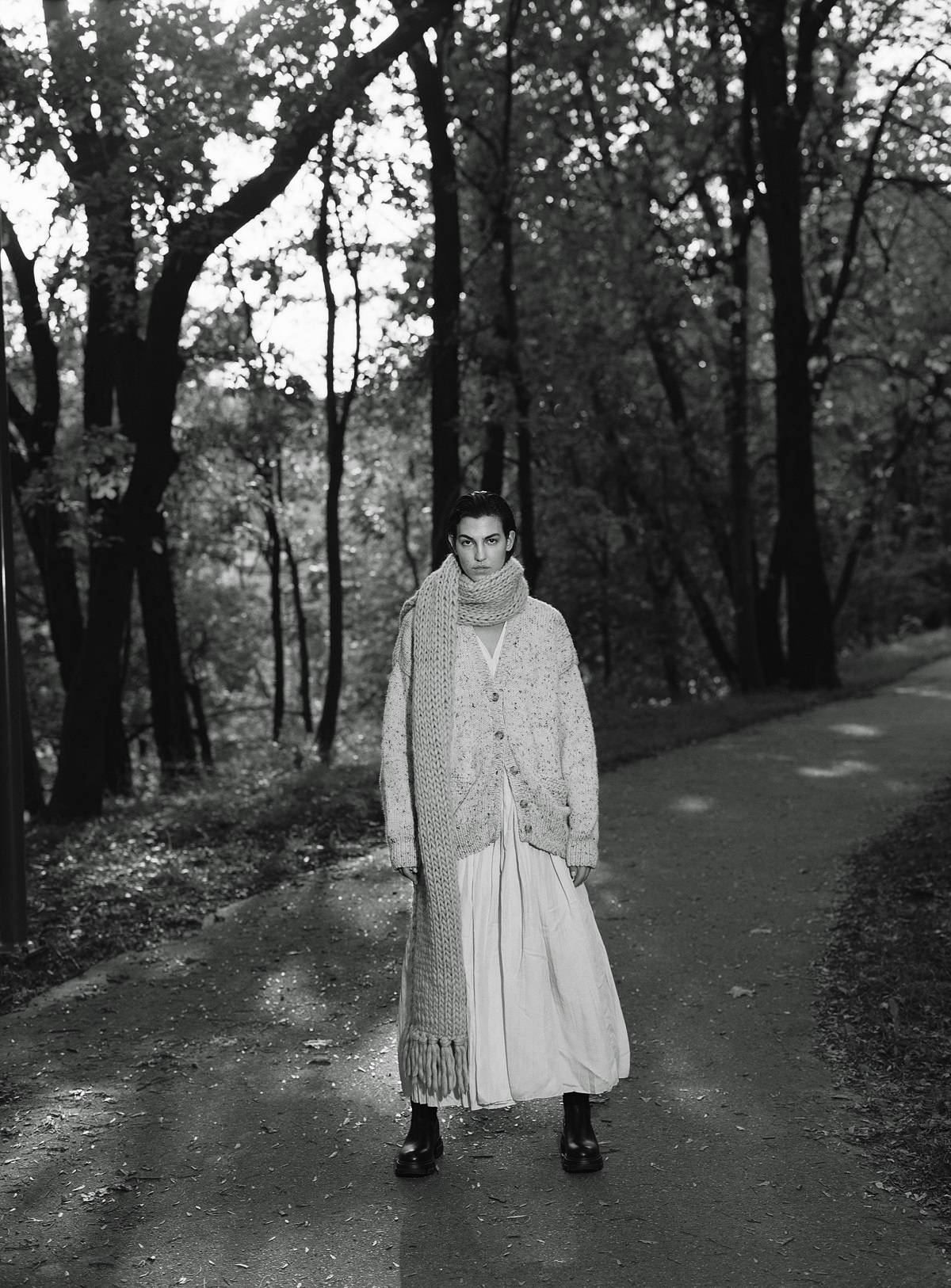 Kremowa biel, szarość, granat i błękit to kolory zaczerpnięte wprost z natury. Wydziergane ręcznie mięsiste swetrzyska, kardigany i golfy to inwestycja na lata – praca ludzkich rąk oraz wysokiej jakości wełny stanowią dowód poważnego podejścia projektantki do mody zrównoważonej, wymykającej się tradycyjnym sezonom i chwilowym trendom. Czarnota od kilku sezonów wykorzystuje też resztki włóczek z poprzednich kolekcji, dzięki czemu powstają kultowe już przeskalowane czapki, a teraz też i długie, ciepłe szale czy patchworkowe kardigany.