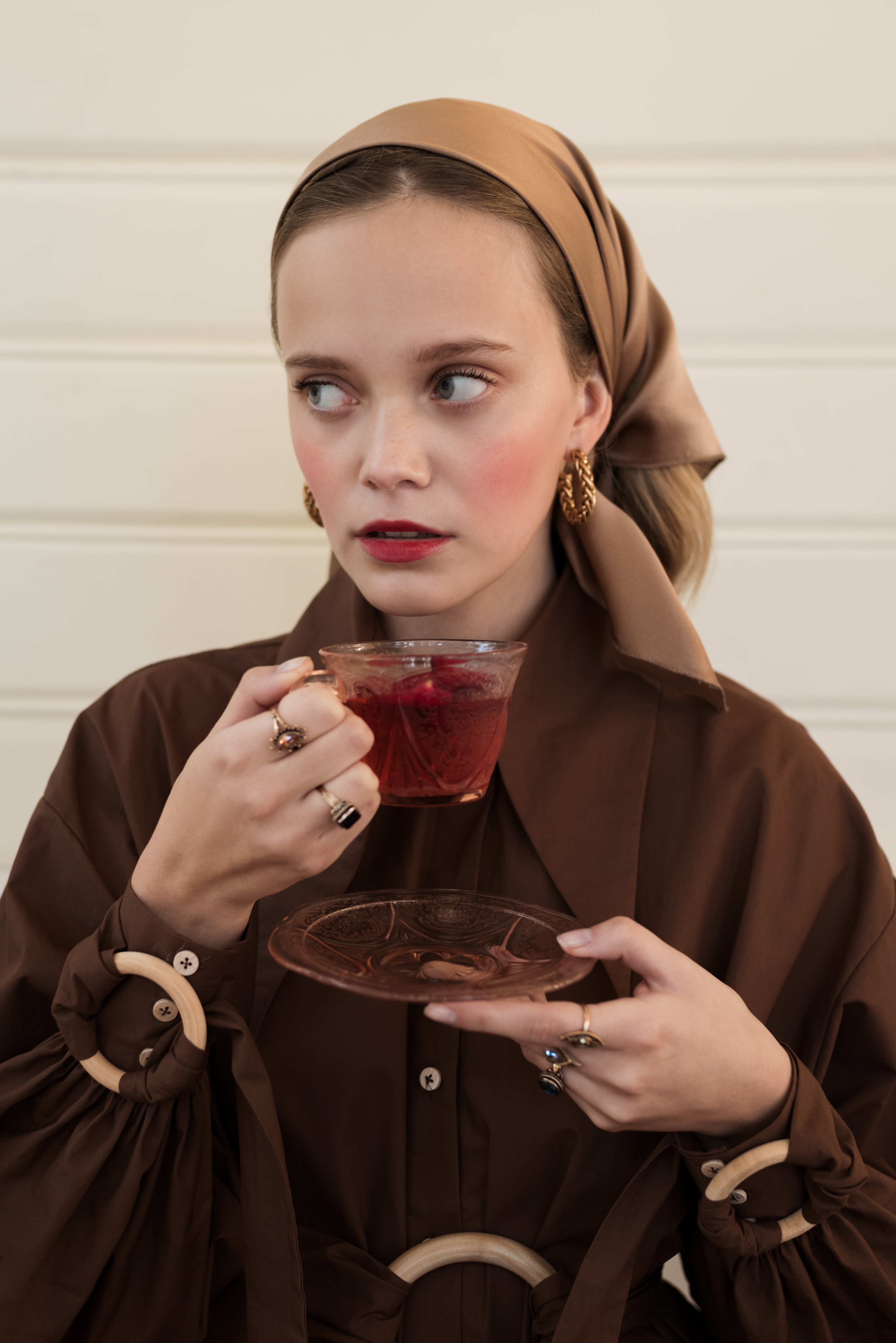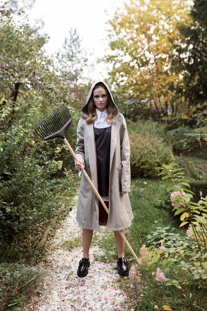 Wszystkie elementy kolekcji zostały uszyte z naturalnych i ekologicznych materiałów. Jedwabny szantung, tencel, bawełna i wiskoza utrzymane są w naturalnych kolorach ziemi, rudości, złamanej bieli i czerni. Naszym faworytem jest zdecydowanie czekoladowa sukienka zapinana na drewniane guziki, z paskiem z efektownym drewnianym kołem, którą można nosić na kilka sposobów – ze stójką lub dużym, odpinanym kołnierzem.