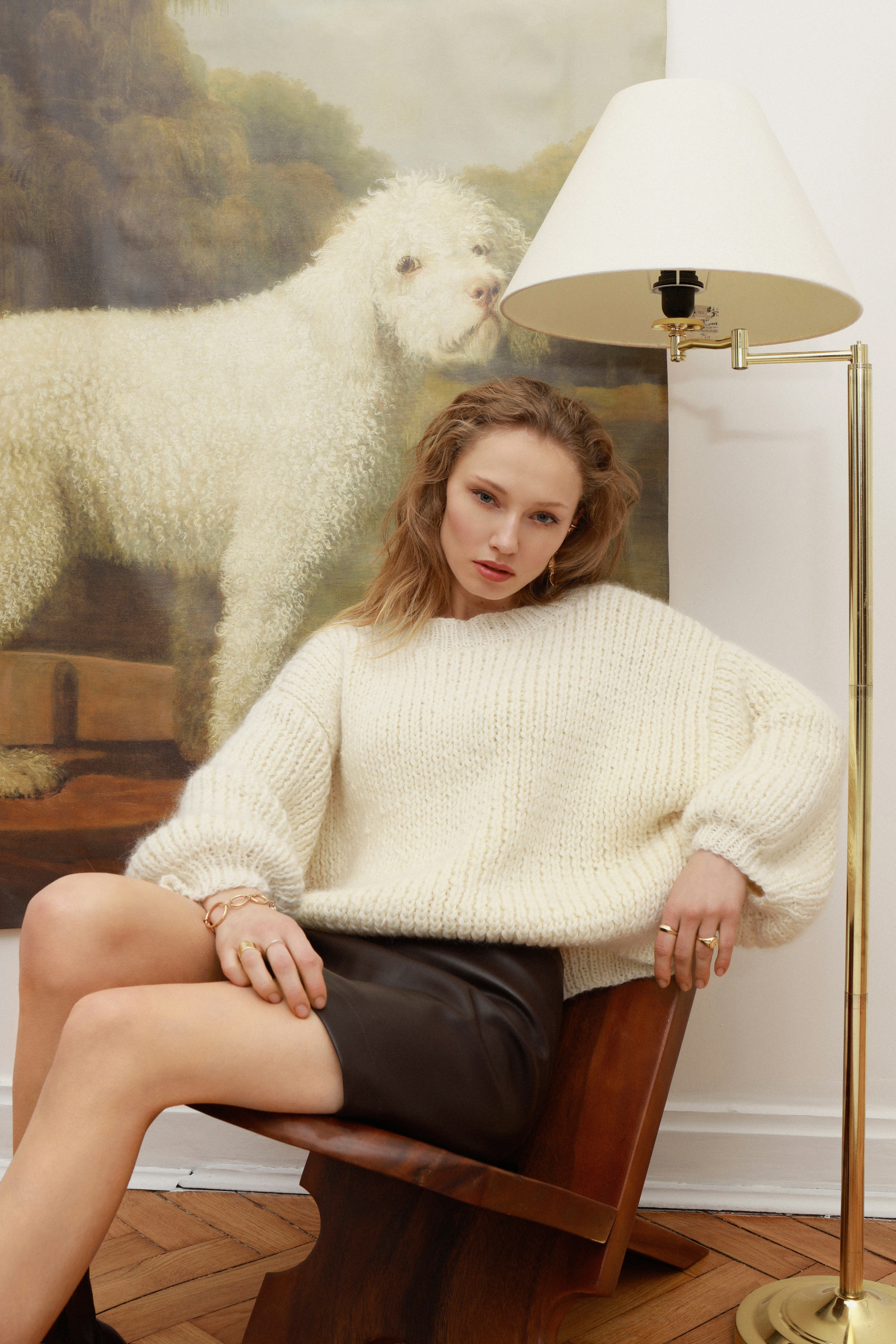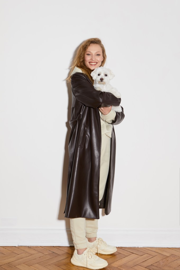 Nowością jest również wykorzystanie sztucznej skóry w pięknym, głębokim odcieniu czekoladowego brązu. Uszyty z niej długi płaszcz o fasonie trencza to absolutny klasyk w szafie minimalistek. Z kolei wykonana z tego samego materiału trapezowa spódniczka mini to doskonała baza zarówno do stylizacji w stylu retro, jak i codziennych zestawień z białą koszulą czy mięsistym kremowym swetrem. Na przykład wydzierganym ręcznie ze szlachetnej mieszanki wełny, moheru i jedwabiu.