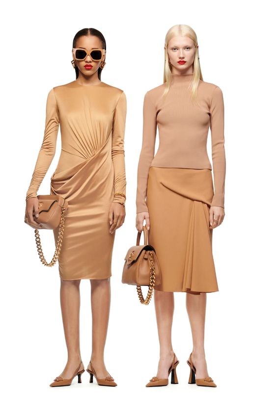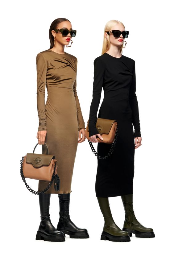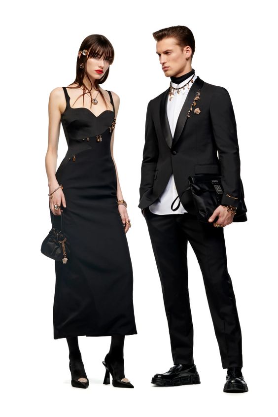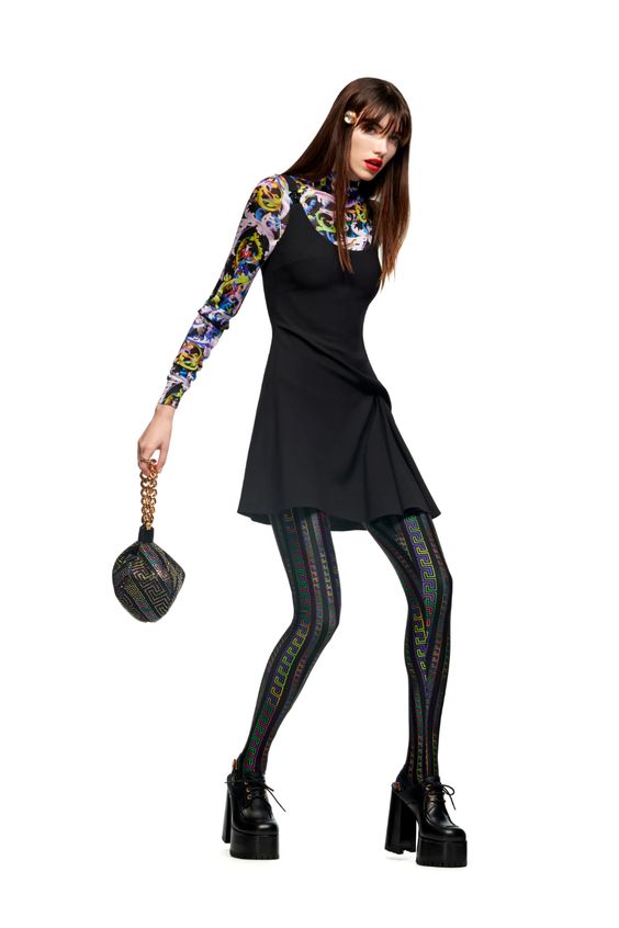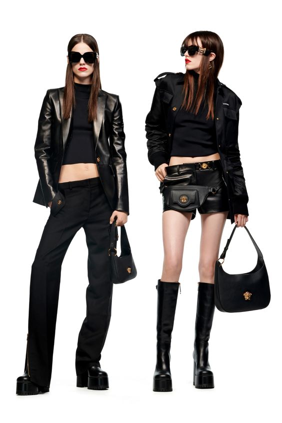 Minimalistyczne spódniczki i sukienki midi, pudełkowe marynarki, mroczne skórzane kurtki jednoznacznie wskazują na okres, z którego Donatella czerpała inspiracje. Patrząc na skórzaną obcisłą sukienkę z dekoltem w kształcie serca i złotymi zawieszkami, natychmiast przychodzi nam na myśl ikoniczna sukienka-agrafka z 1994 roku. Subtelny romans z subkulturą punkową uwidacznia się też w postaci masywnych butów na platformach, skórzanych total looków i złotych łańcuchów.