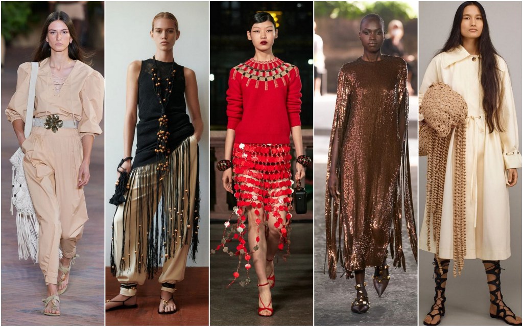Nawiązują do stylu etnicznego i rękodzieła. Pojawiają się przy dużych torbach lub tunikach, a w wersji wieczorowej okraszone są błyszczącymi cekinami.