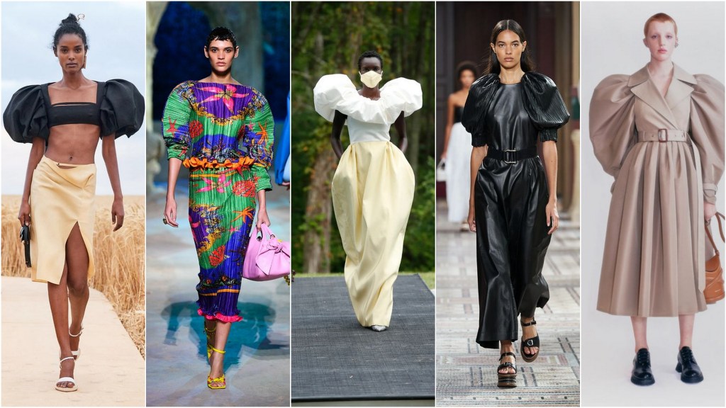 Bufki początkowo lekko zaokrąglone, rosną do coraz bardziej monstrualnych rozmiarów. Przywodzi to na myśl szalone lata 80., jednak dzięki stonowanym kolorom i pozostałej części stroju utrzymanej w ryzach zyskujemy nowoczesny wygląd.
