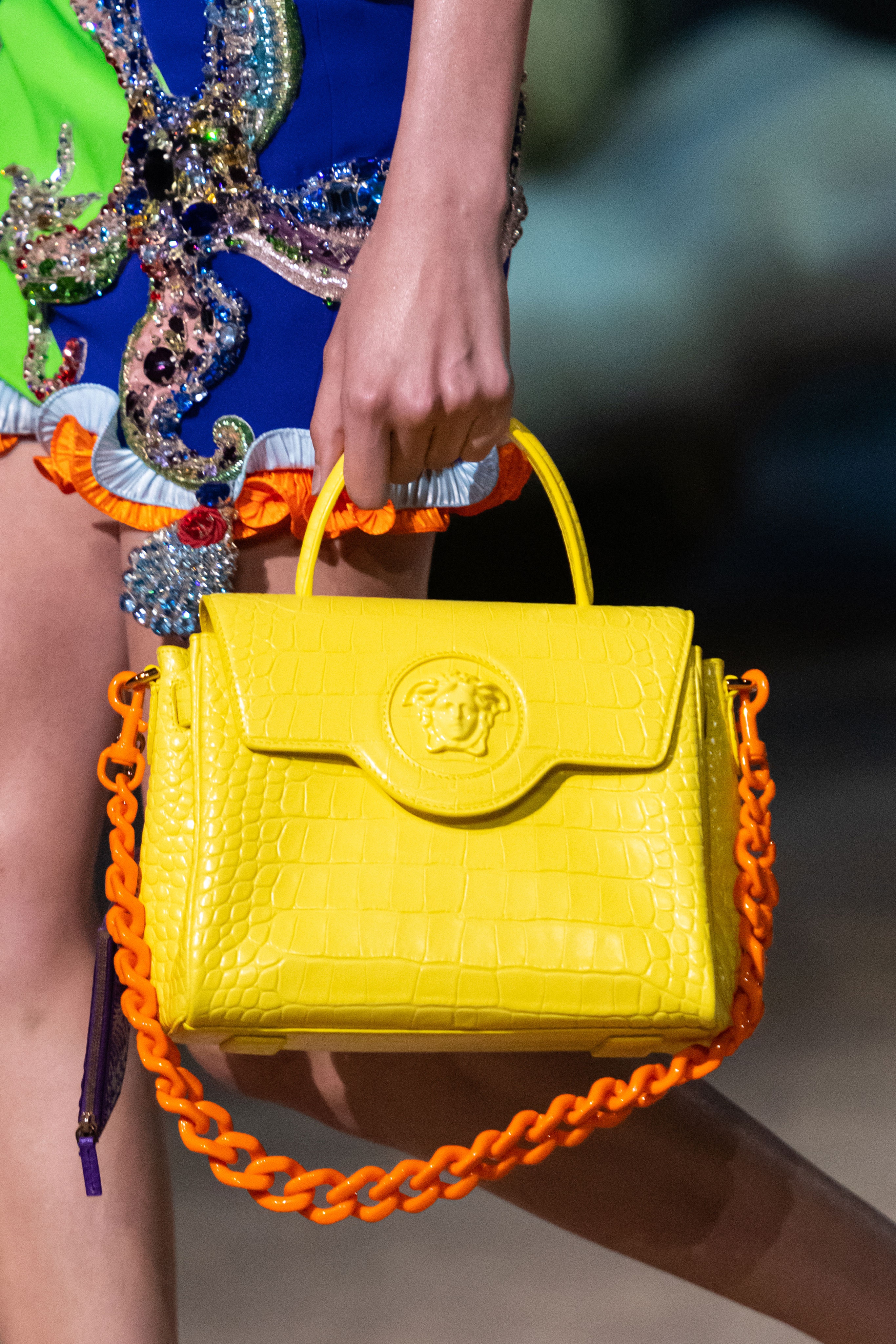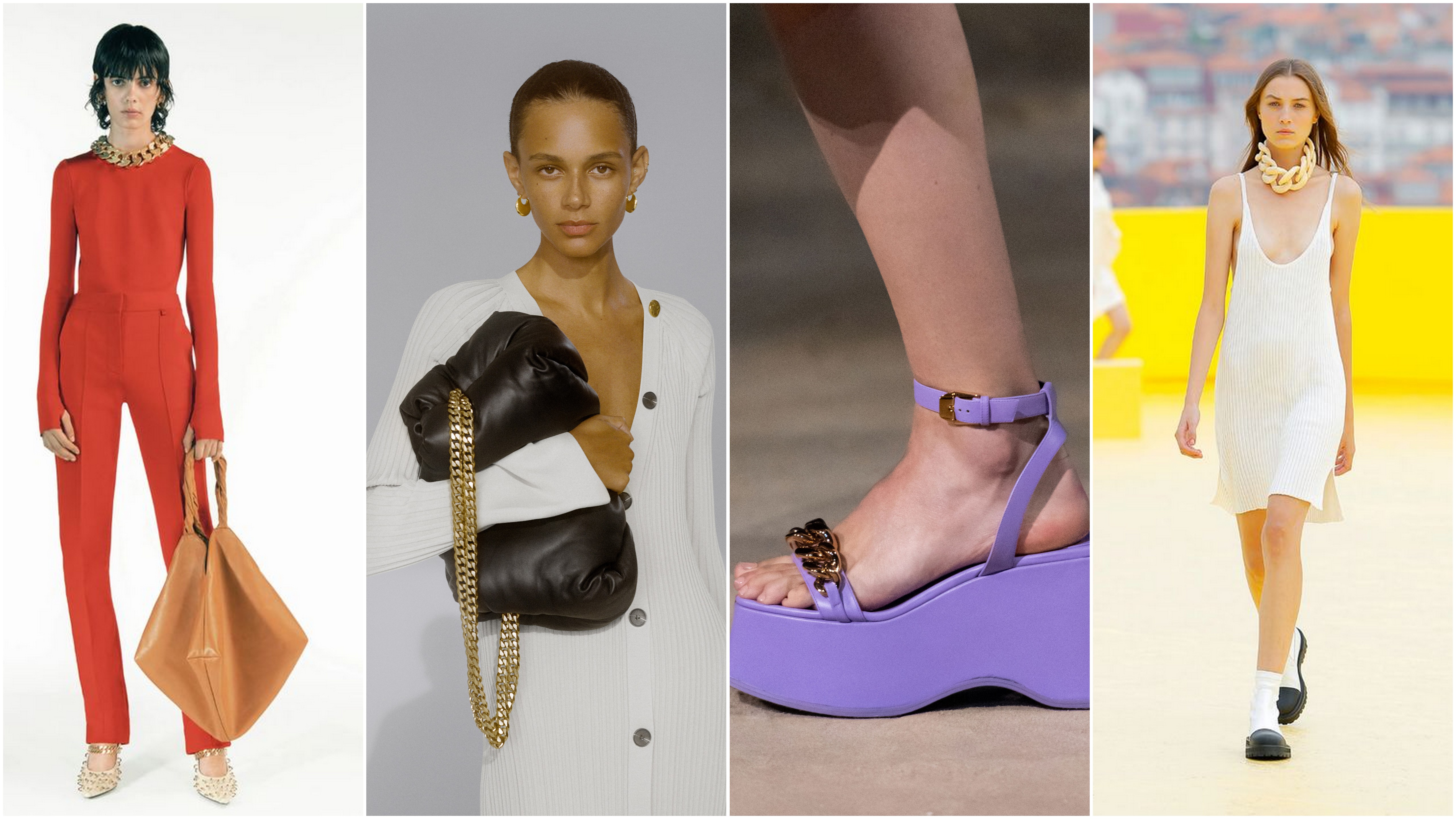 Zarówno w formie biżuterii, jak i elementu obuwia czy torebki – łańcuchy nadal pozostają bardzo silnym trendem nadchodzącej wiosny. Nosimy naszyjniki i bransoletki z mocno przeskalowanymi ogniwami lub inwestujemy w loafersy ozdobione łańcuchem. Możemy też postawić na torebkę z dekoracyjnym łańcuszkowym uchwytem – bardzo często są one odpinane, dzięki czemu możemy zmieniać ich charakter w zależności od nastroju.