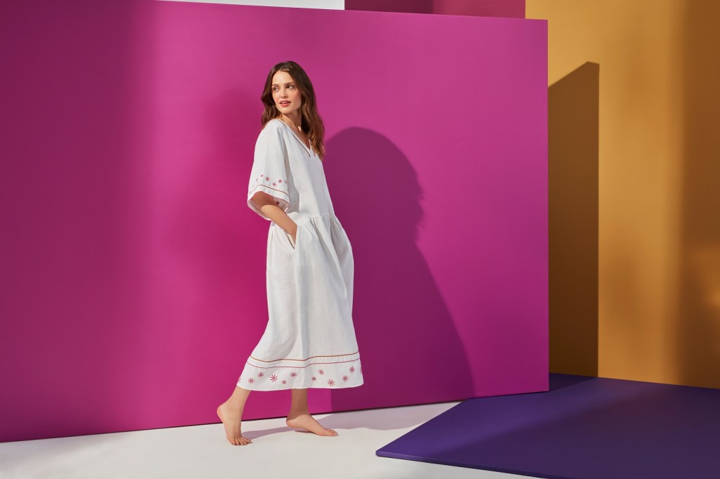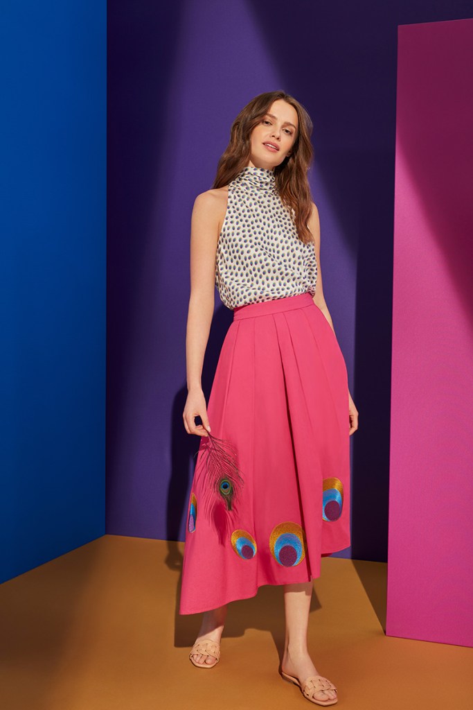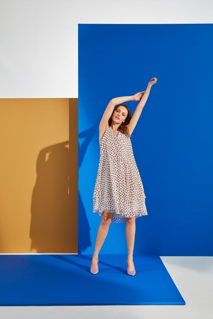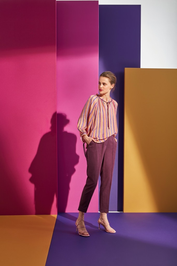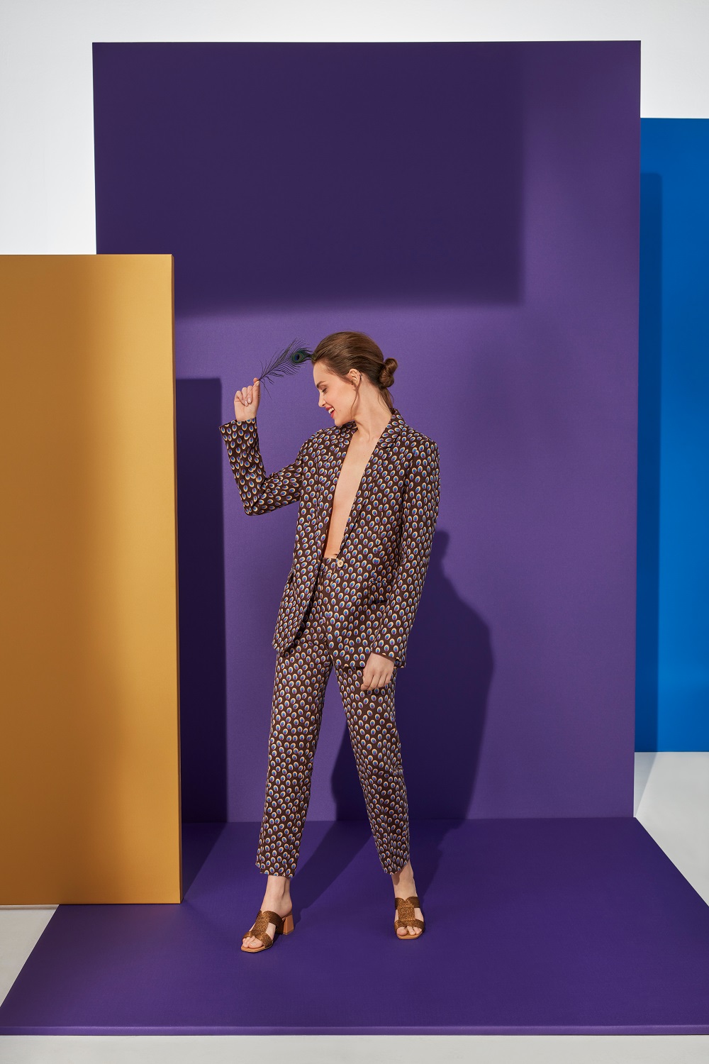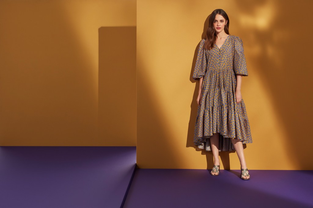 Ubrania wiosennej kolekcji są zachowawcze pod względem fasonów – znajdziemy tu między innymi spodnie cygaretki, lekko przedłużane marynarki, wiązane pod szyją bluzki oraz swobodne, trapezowe sukienki w modnej długości midi lub mini. Gdzieniegdzie pojawia się detal w postaci asymetrii spódnicy czy kloszowanego rękawa. Jednak zastosowanie nowych autorskich tkanin oraz folkowych haftów sprawia, że każdy element jest wyjątkowy, a zarazem można je swobodnie łączyć z ubraniami z poprzednich sezonów.