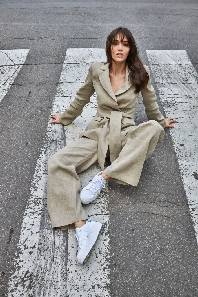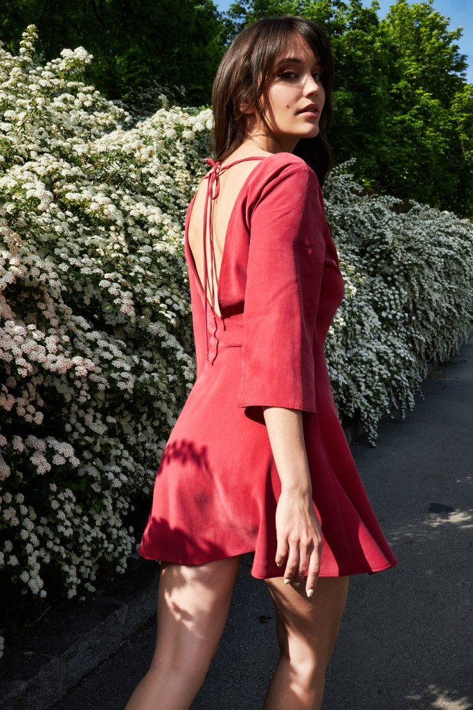 Kobieta La Sérénité jest pewna siebie – raz zakłada sukienkę mini z odsłoniętymi plecami, innym razem obszerny garnitur, w obu wersjach czując się tak samo dobrze. Sukienki pojawiają się również w wersji midi, na cienkich regulowanych ramiączkach jak w latach 90. lub o kroju szmizjerki, nadającego charakteru vintage. Garnitur raz występuje w wersji z luźnymi spodniami, innym razem z szortami albo minispódniczką. Kolekcję uzupełnia biała koszula o skróconej długości, z retro kołnierzykiem.