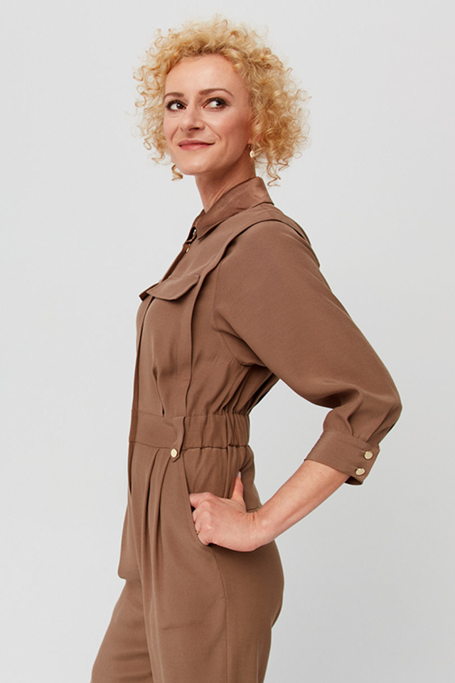 W kolekcji pojawiły się klasyczne garnitury, kobiece sukienki, wygodne kombinezony, ale też i komplety dresowe, które w ostatnich miesiącach stały się nowym uniformem, a ich widok w biurach czy w połączeniu z eleganckimi elementami garderoby nikogo już nie dziwi. Ubrania utrzymane w odcieniach beżu i bieli, urozmaicone deseniem grochów i nadruku imitującego łańcuchy charakteryzują się klasycznymi, ponadczasowymi krojami. Wykonane z naturalnych materiałów takich jak len czy jedwab, dają gwarancję na to, że będą służyć przez długi czas.