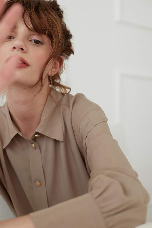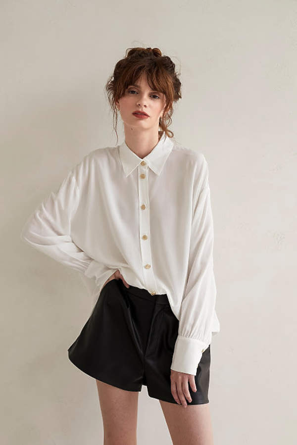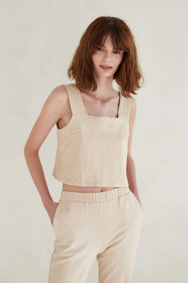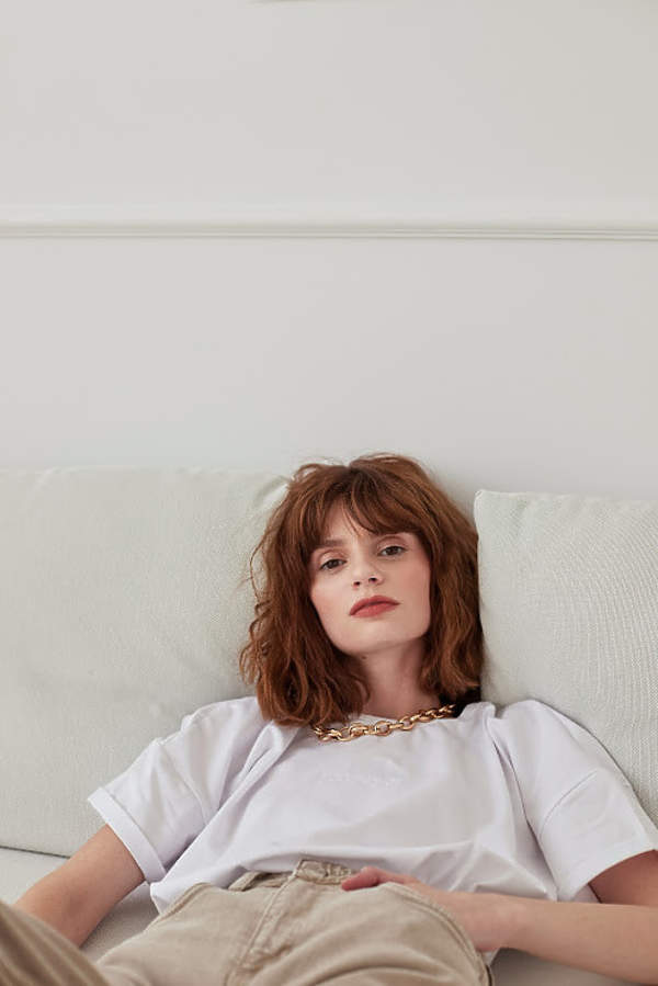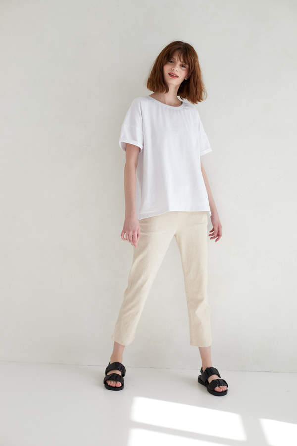 Zachwyca również prosty zestaw – krótki top z kwadratowym dekoltem i wygodne spodnie na gumce z lekko podwyższonym stanem, uszyte z mieszanki wiskozy i lnu. Nie można też zapomnieć o T-shirtcie z organicznej bawełny, wykończonym subtelnym haftem z logo marki. Jego obniżona linia ramion i lekko przeskalowany fason wyróżnia go spośród innych, masowych T-shirtów. Kolekcję wieńczy koszula Sophie – jej przeskalowany krój i ozdobne guziki nadające jej retro charakteru to cechy, dzięki którym stała się niekwestionowaną gwiazdą kolekcji.