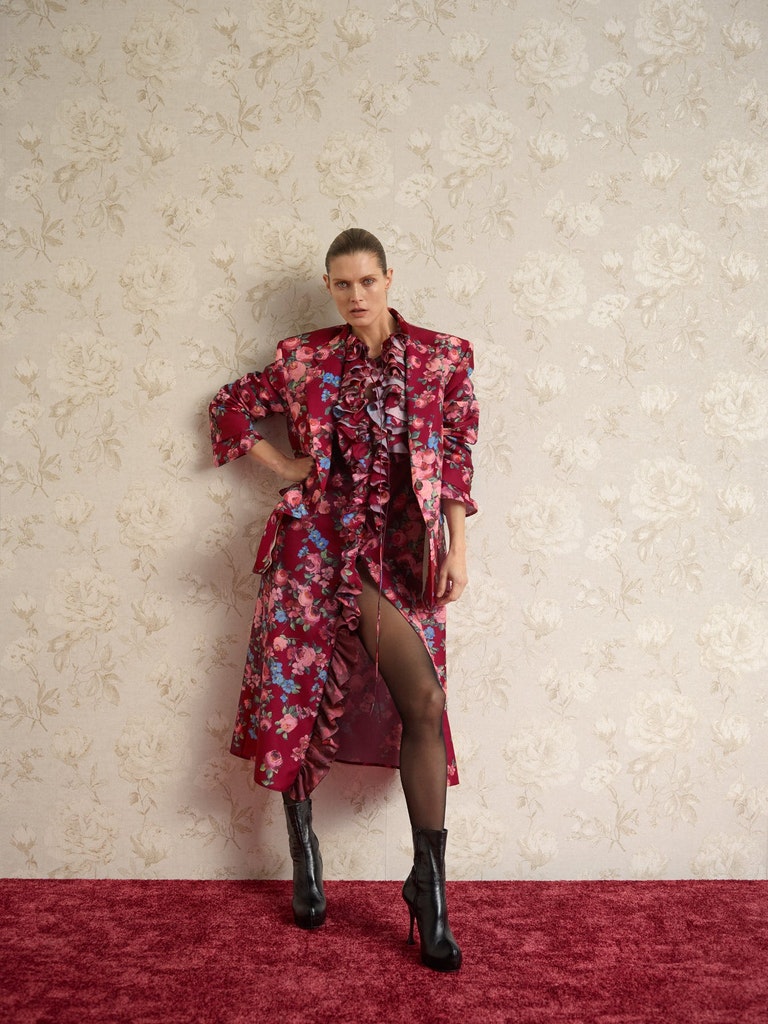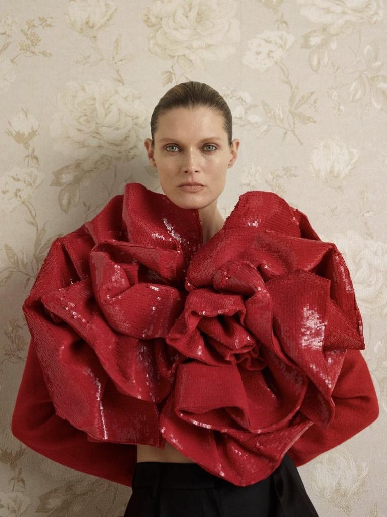 Na wieczór Butrym proponuje oczywiście seksowne mini sukienki z wycięciami i aplikacjami w kształcie kwiatów, tym razem w rozmiarze XXL. Dopasowane kroje podkreślają talię i ramiona, nie brakuje też dziewczęcych falban i kwiatowych wzorów. A jeśli nie sukienka, to cekinowy smoking, zarzucony na gołe ciało. Jak kiedyś u Saint Laurenta.