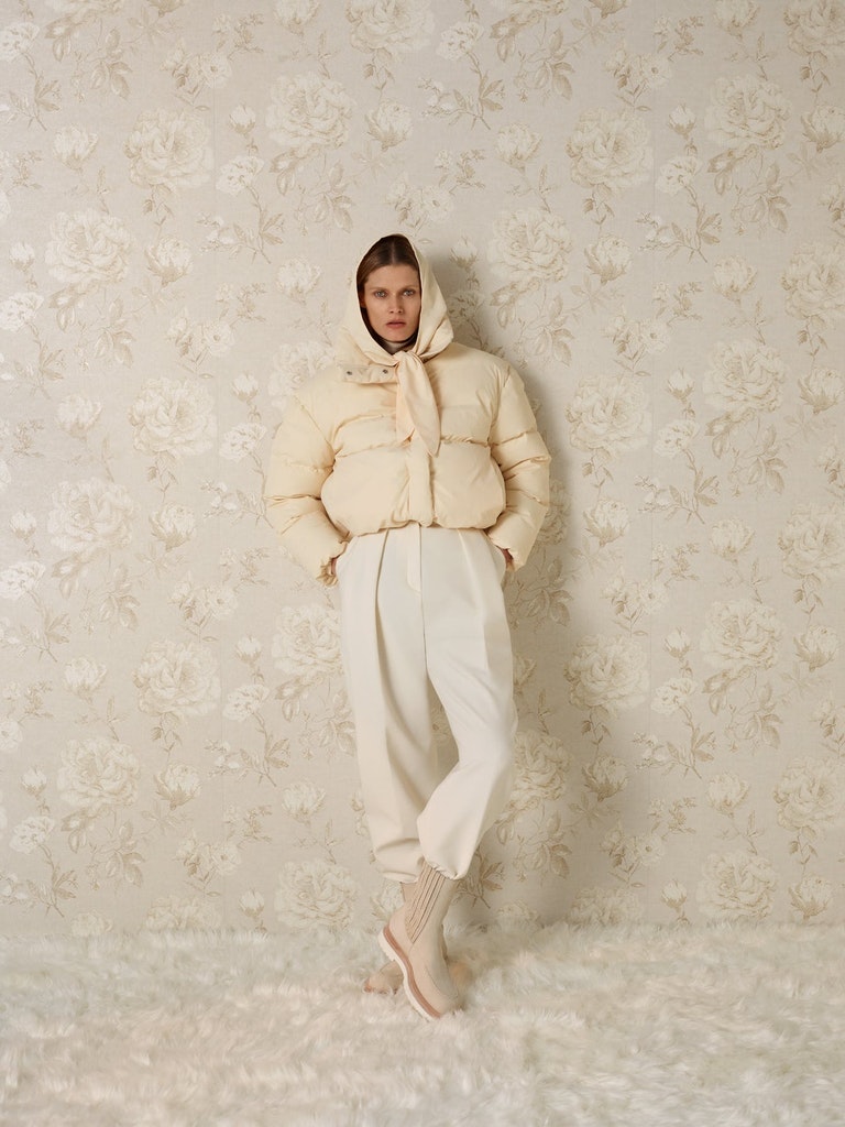 Dzianiny tym razem występują pod postacią dopasowanych rozpinanych swetrów z kołnierzykiem oraz sportowych bluz z zamkiem pod szyją. Fenomenalny skórzany garnitur w czekoladowym odcieniu brązu z pewnością stanie się hitem tej kolekcji, tuż obok krótkiej, puchowej kurtki z kapturem wiązanym pod szyją jak chustka. Nawiązań do najnowszych trendów jest więcej, jednak za każdym razem projektantka dba o to, by jej unikalny styl grał pierwsze skrzypce.