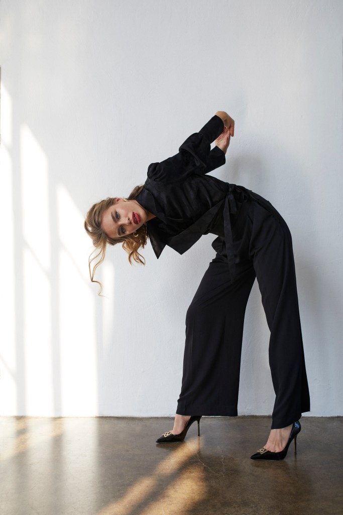 Co sezon Karolina wzbogaca kolekcje o pasujące do koszul spodnie, tak by stworzyć kompletną i funkcjonalną kapsułę. Propozycja na jesień i zimę to czarne spodnie z wysokim stanem i szeroką nogawką, z eleganckiej lejącej tkaniny. Posiadają napy na wysokości talii, dzięki którym możliwe jest idealne dopasowanie ich do sylwetki. Pasują zarówno do koszul z nowej kolekcji, jak i do tych z poprzednich sezonów.