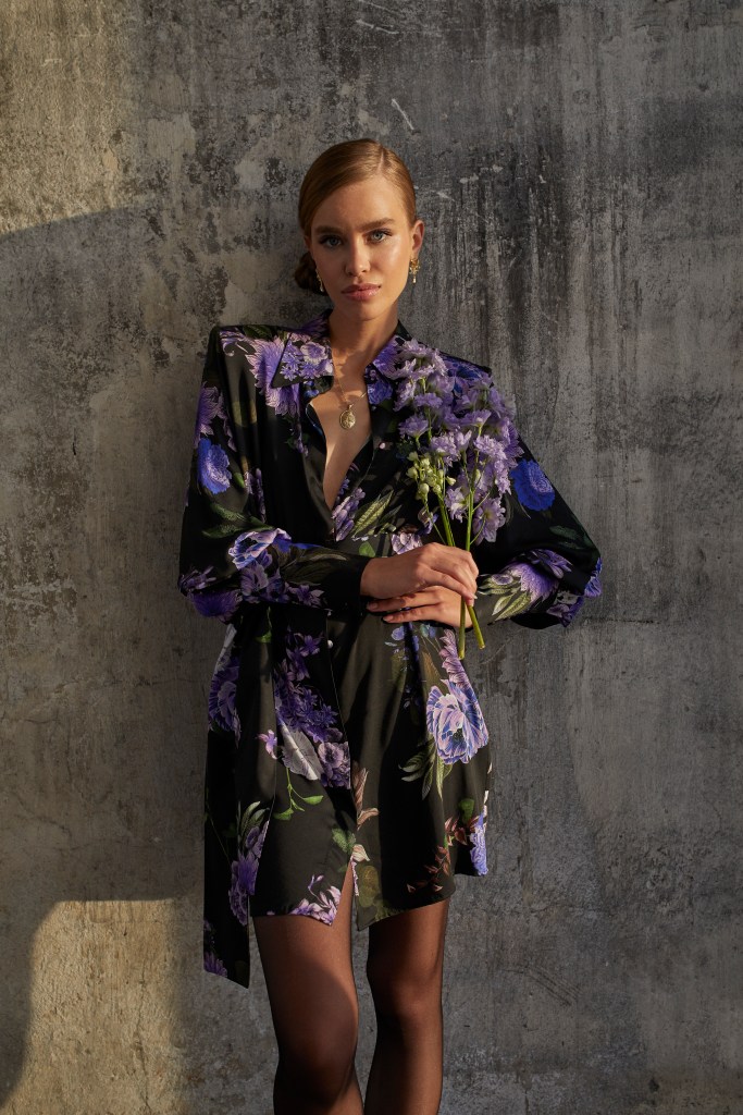 Druga sukienka to absolutna nowość: długość mini, rozpinany kołnierzyk i absolutnie zachwycający kwiatowy deseń. Tutaj również diabeł tkwi w szczegółach: charakterystyczne przedłużane mankiety zapinane są na guziczki obleczone tkaniną, a za pomocą paska możemy dowolnie modelować sylwetkę.