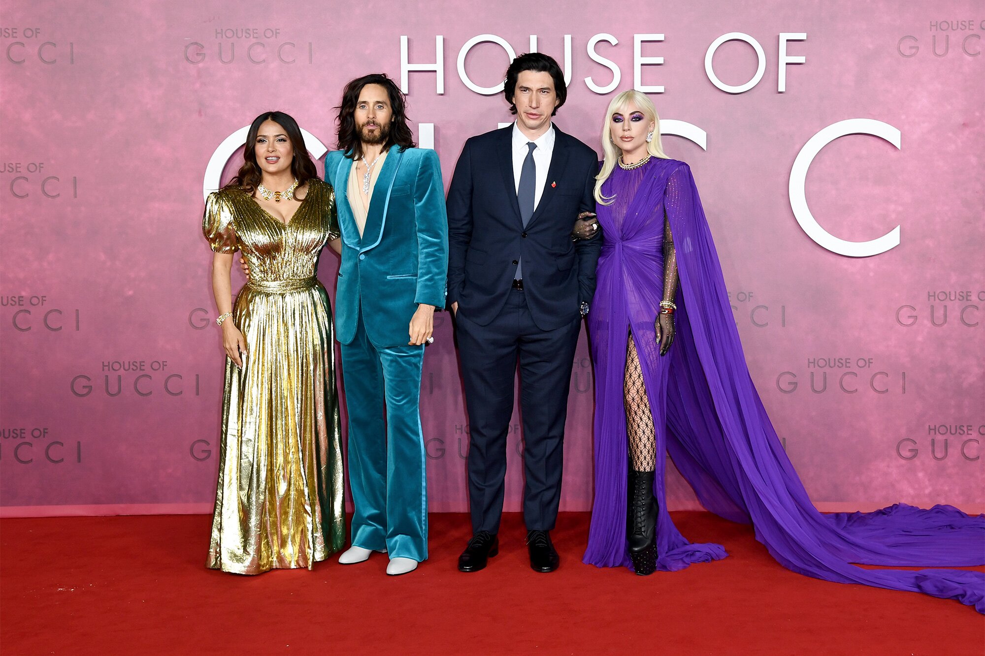 Na premierze filmu w Londynie Lady Gaga pojawiła się w kreacji z najnowszej kolekcji Gucci, „Love Parade„: fioletowa prześwitująca suknia z udrapowanego tiulu ukazująca pończochy, masywna biżuteria, przezroczyste rękawiczki i ulubione przez artystkę buty na niebotycznych platformach to mariaż stylu Patrizii Reggiani, która kochała przepych i maksymalizm, oraz Lady Gagi, która doskonale czuje się w przerysowanych odważnych strojach.