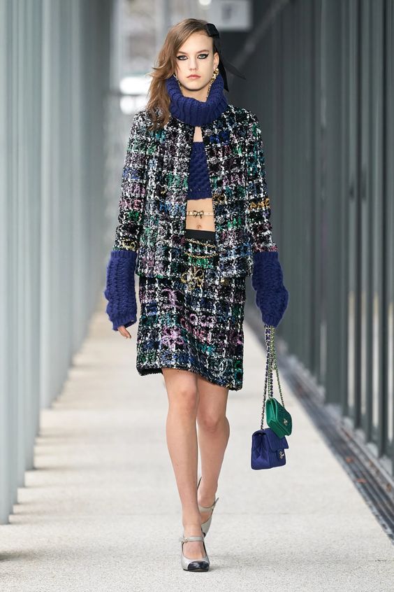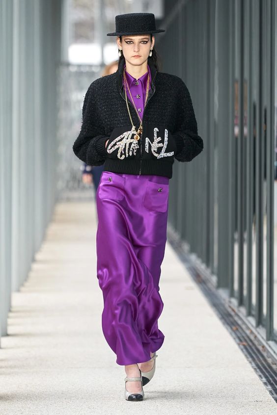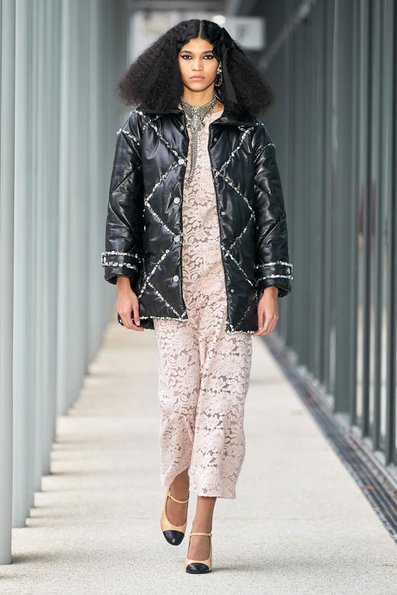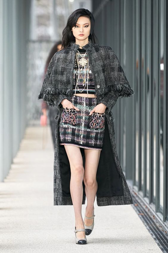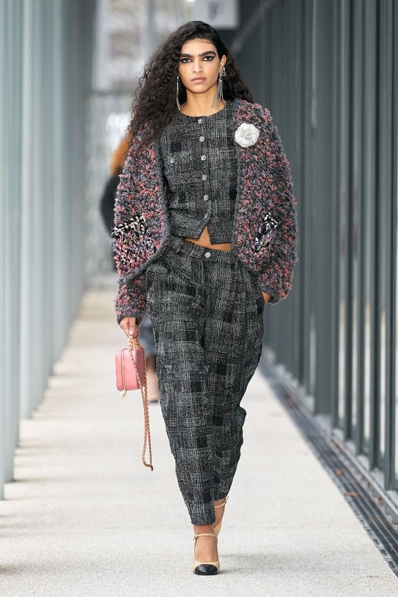 Kolekcja Métiers d’Art została zaprezentowana w nowo otwartym budynku Le19M, w którym mieszczą się warsztaty rzemieślnicze domu mody. Fasada budynku zaprojektowana przez Rudy’ego Ricciotti nawiązuje do misternie haftowanej tkaniny haute couture, a motyw ten został powielony przez Virginie Viard w nowej kolekcji. Najpierw na kieszeniach długiego, kolumnowego płaszcza otwierającego pokaz, potem na różowych tweedach i fioletowych kompletach z grubo dzierganej dzianiny.