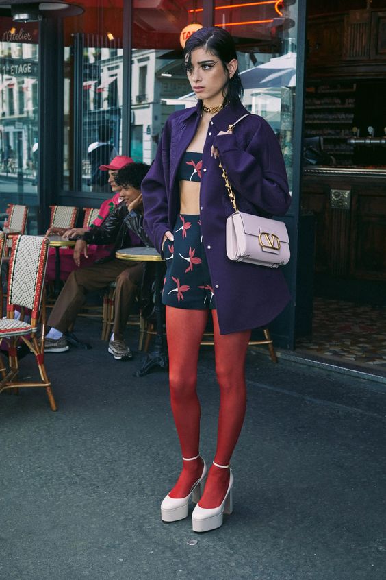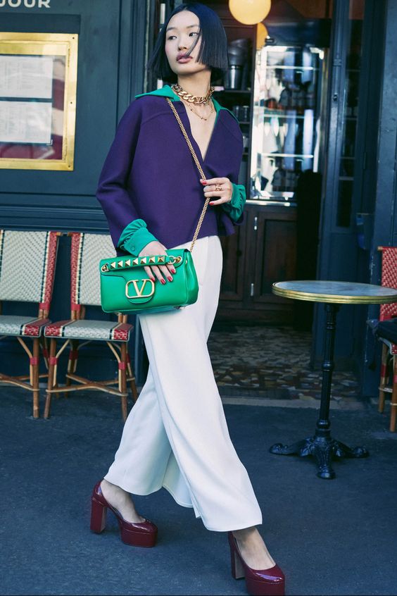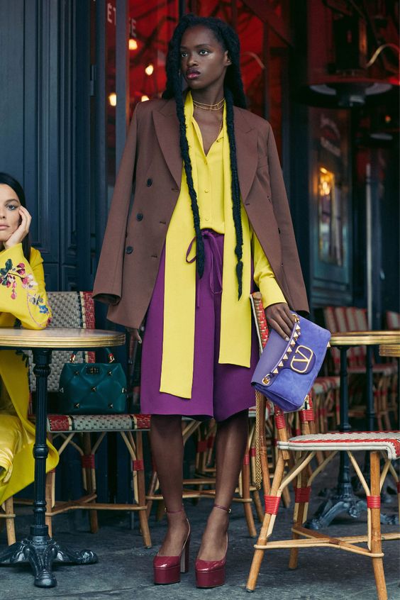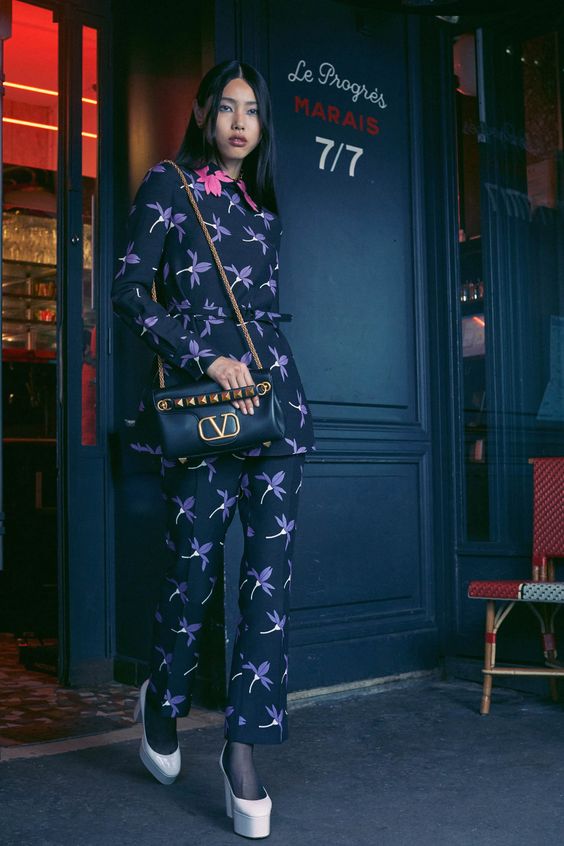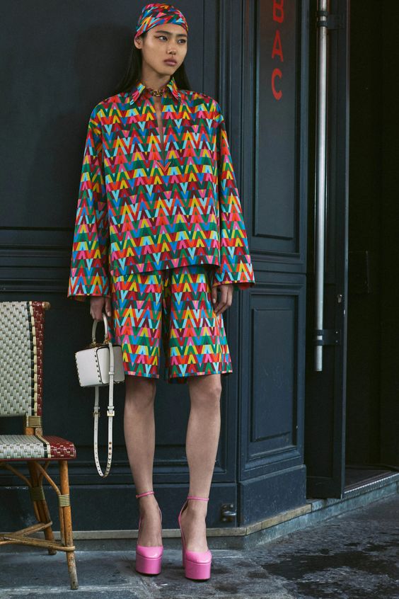 Zaczynając od świetnie skrojonego, lecz miękkiego garnituru z szortami w kolorze mlecznej czekolady, przez eleganckie koszulowe bluzki łączone z szerokimi spodniami typu palazzo, aż po zamaszyste peleryny obszyte piórami – to bardziej elegancka strona Valentino. Z drugiej mamy dżinsowe szorty i sportowe buty, króciutkie topy, wzorzyste komplety z nadrukiem ważki albo kultowego już monogramu z powielonych liter V, oraz neonowe kurtki. Łącznikiem są akcesoria: torebki z widocznym logo nabijane ćwiekami i buty na masywnych platformach.