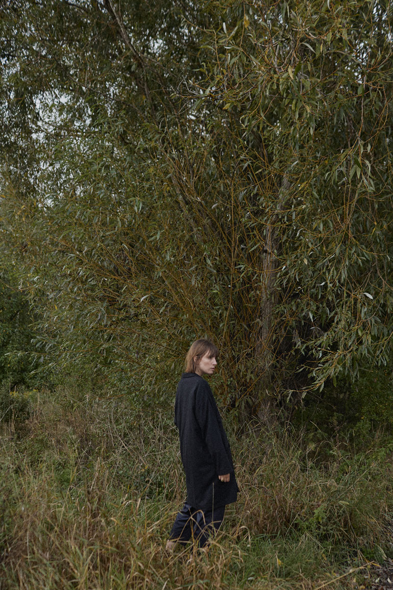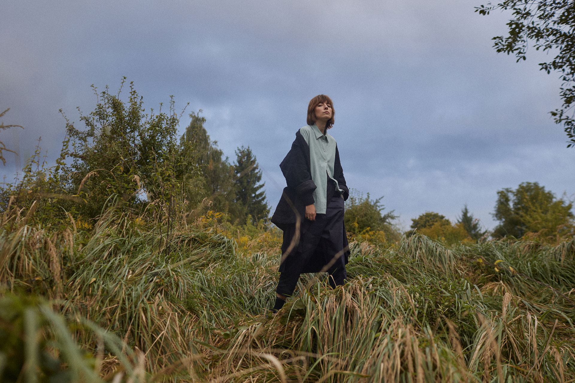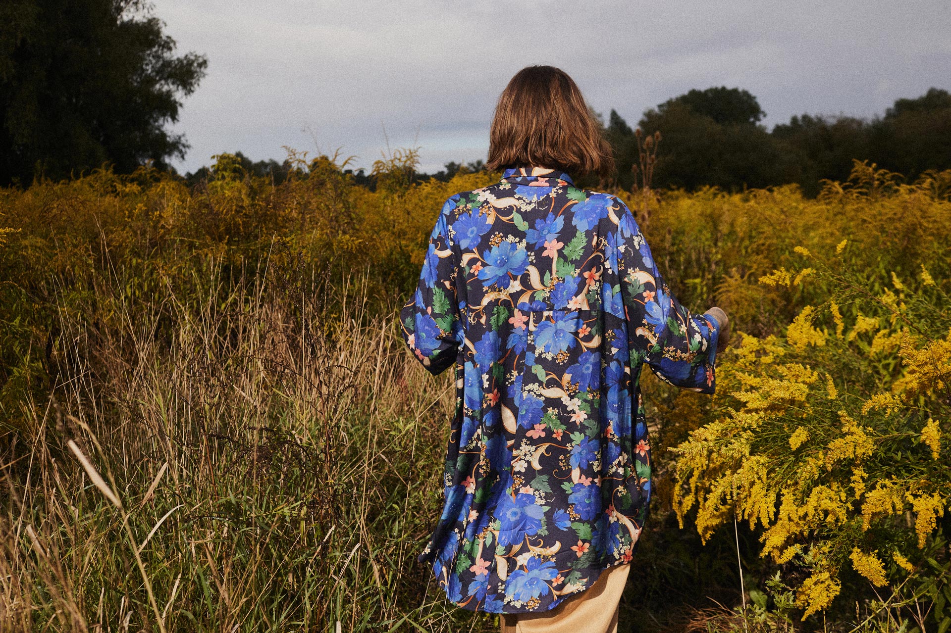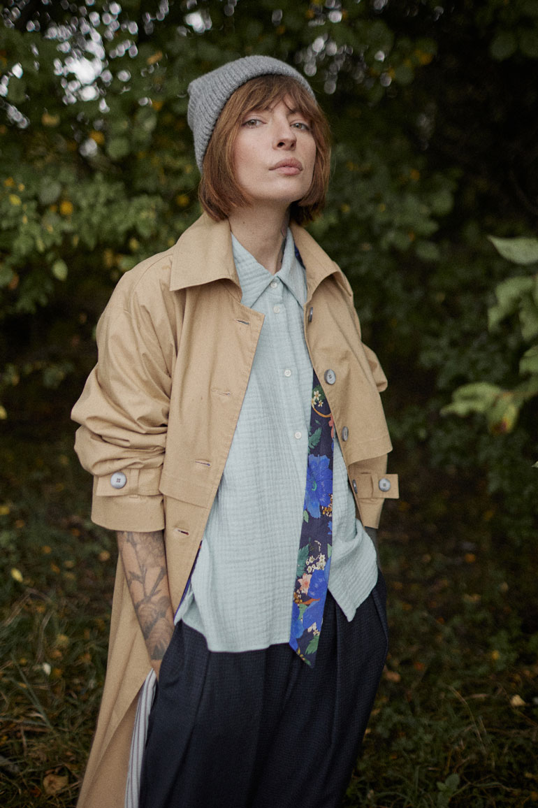 Kolekcję uzupełnia klasyczny jednorzędowy trencz inspirowany męskim płaszczem, wpisujący się w stonowaną, grafitowo-szaro-beżową paletę. Natomiast kropką nad i jest wzorzysta koszula w chabrowe kwiaty stylizowana na vintage. To ona stanowi intrygujący element dopełniający całość i wprowadza odrobinę nowoczesności.