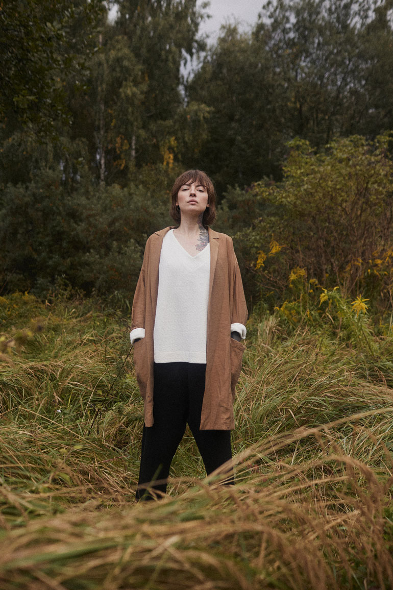 U Kulty marynarka przypomina bardziej miękki otulacz niż sztywny uniform. Uszyta z przyjemnej wełny, zapinana na trzy guziki i sięgająca poniżej bioder z naszytymi dużymi kieszeniami może pełnić funkcję eleganckiego okrycia lub wygodnego kardiganu. Podobnie rzecz ma się ze sweterkowymi bluzami z bawełny o dekoracyjnym, „gofrowym” wykończeniu, które doskonale odnajdą się w wielu różnych stylach.