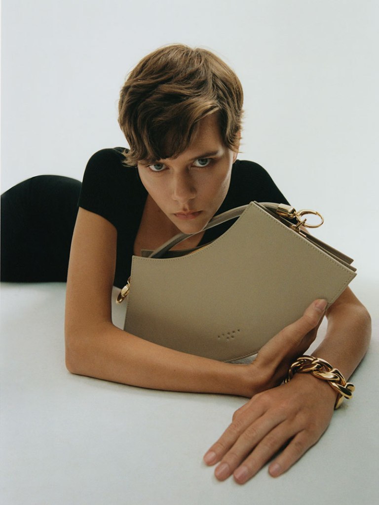 Wśród nowości zaskakują torby typu Shopper o wydłużonych, prostokątnych kształtach, wykonane z miękkiej skóry. Dzięki ergonomicznemu kształtowi mogą być wygodnie noszone na ramieniu. Kolejnym geometrycznym smaczkiem jest torebka w kształcie łuku, z przodu zachwycająca oszczędną formą, z boku prezentująca harmonijkową konstrukcję przywodzącą na myśl torebki vintage.