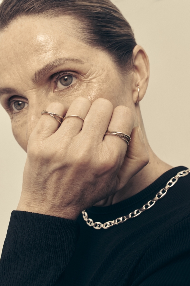 Głównym elementem kolekcji Anny Ławskiej „Irma” są naszyjniki z łańcucha wykonane z rytmicznych masywnych ogniwek. Każde z nich jest szlifowane ręcznie, dzięki czemu naszyjnik pięknie opływa szyję i nadaje eleganckiego charakteru. Na wzór łańcucha powstały też subtelne kolczyki złożone z mniejszych ogniw. Sygnety pozbawione typowych wybrzuszeń, zyskały skromne, gładkie powierzchnie, a delikatne pierścionki z cienkich obręczy zaczynają się krzyżować, tworząc ciekawy trójwymiarowy efekt.