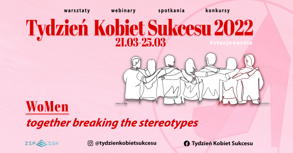 Porozmawiajmy o tym! Już 21 marca startuje XVI edycja Tygodnia Kobiet Sukcesu organizowana przez Zrzeszenie Studentów Polskich Szkoły Głównej Handlowej! W tym roku towarzyszy nam hasło WoMen – together breaking the stereotypes, ponieważ jako organizatorzy projektu chcemy pokazać, że krzywdzące stereotypy dotykają nie tylko kobiet, ale też mężczyzn.