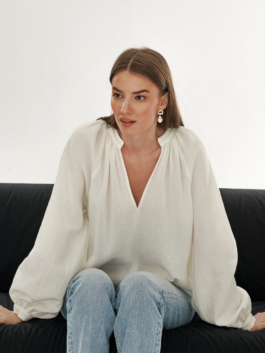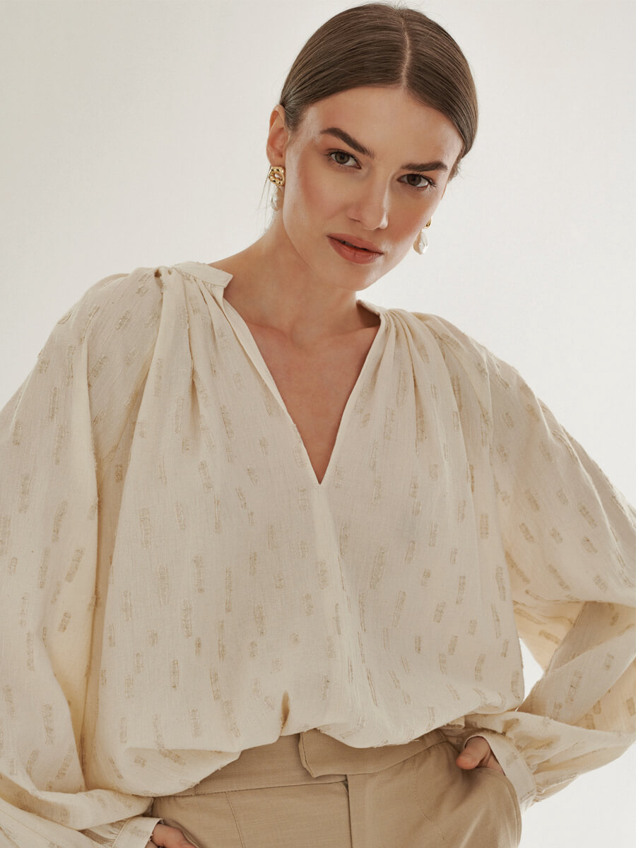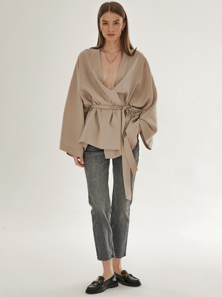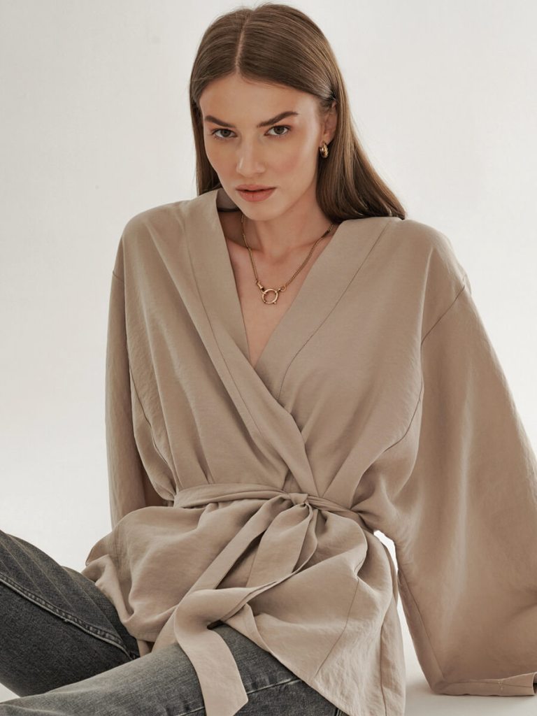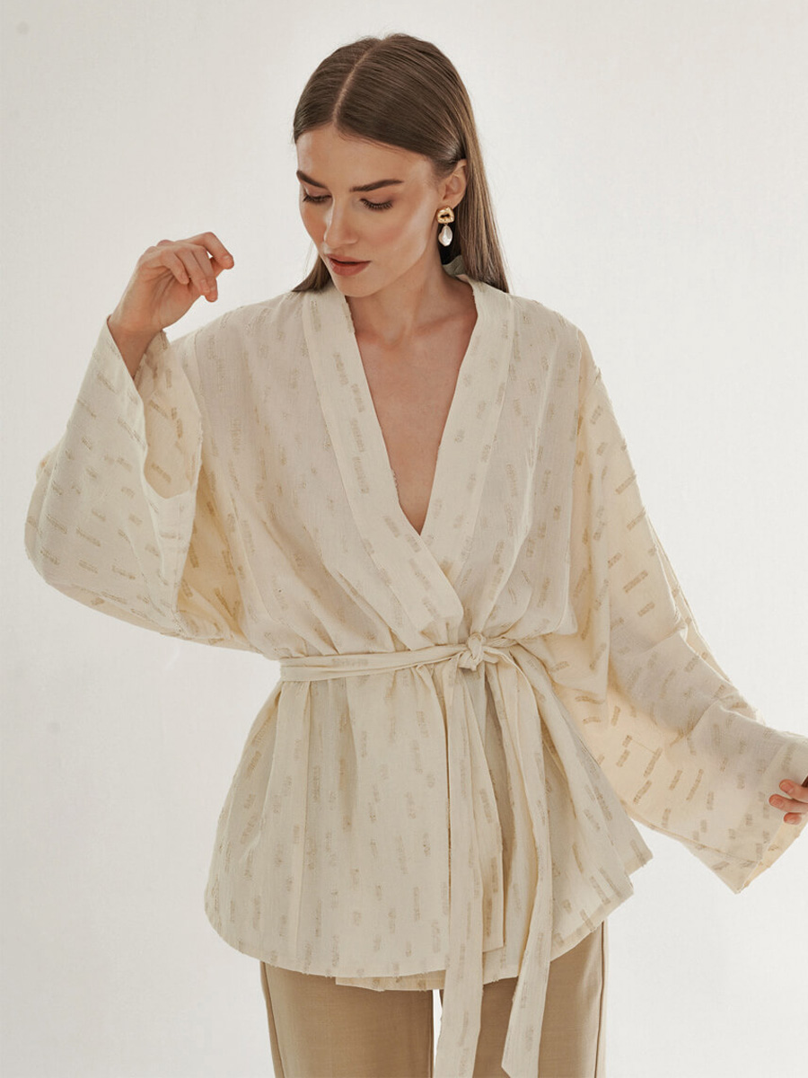 Koszula Isere z dekoltem V o obszernym kroju ma z kolei bufiasty rękaw zakończony mankietem oraz zdobne marszczenie na ramionach. Została uszyta w dwóch wersjach: z żakardowej tkaniny w odcieniu ecru w subtelny wzór oraz złamanej bieli. Prawdziwym hitem kolekcji jest jednak kimono – to wygodna i stylowa propozycja na wiele sezonów. Przeskalowany krój, szeroki rękaw i wiązanie w talii umożliwia noszenie go na kilka sposobów. Kimono występuje w dwóch odsłonach: w zgaszonym odcieniu taupe, z materiału o ciekawej mięsistej strukturze, oraz w tej samej żakardowej tkaninie co koszula Isere.