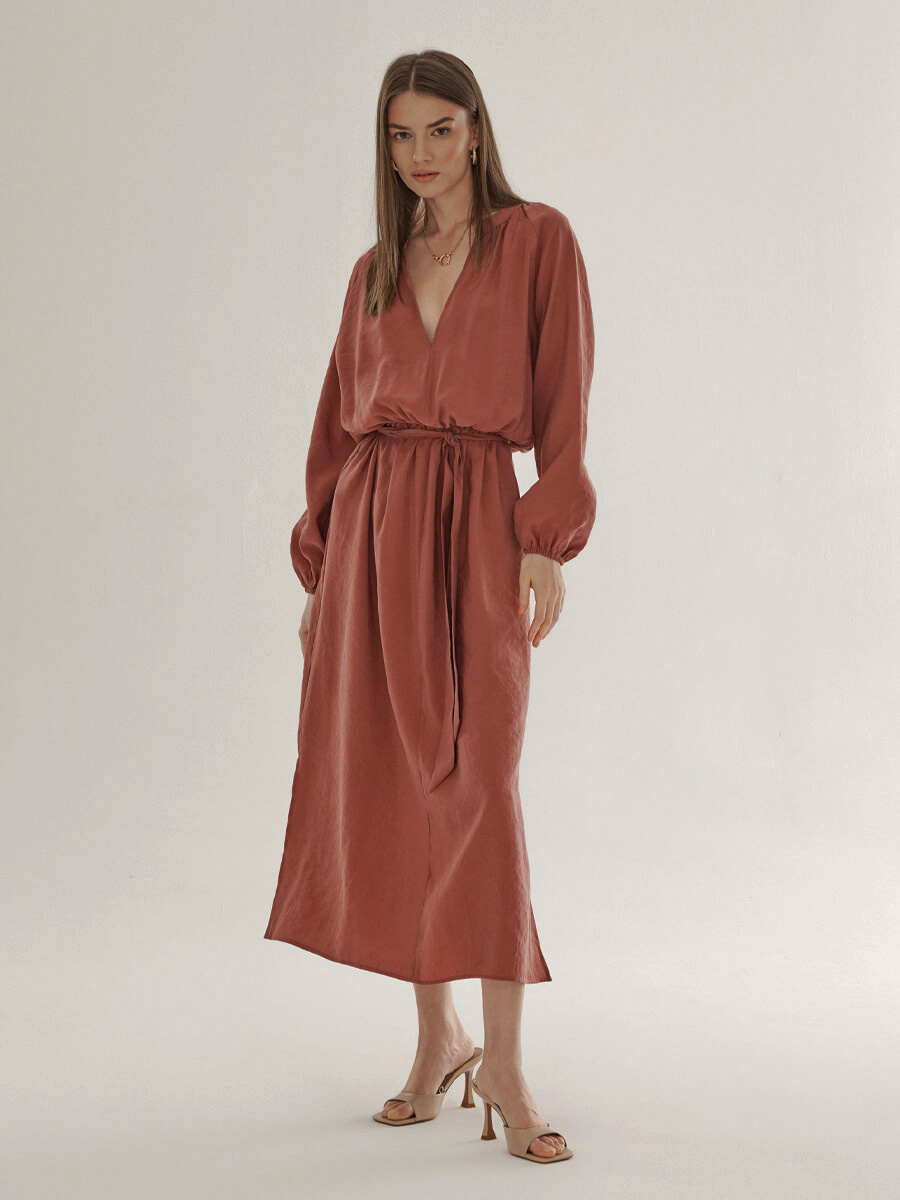 Wiosenno-letnia kolekcja Ajusté to zaledwie trzy nowe modele, których wspólnym mianownikiem jest krój opracowany na bazie inspiracji kimonem. Zwiewna sukienka w kolorze marsala z marszczeniem przy karczku, charakteryzuje się kimonowym rękawem zakończonym gumką, posiada również rozporki po bokach oraz komfortową gumkę w pasie. Pasek z tej samej tkaniny dołączony do sukienki można zamienić na swój ulubiony, by jeszcze bardziej podkreślić talię.