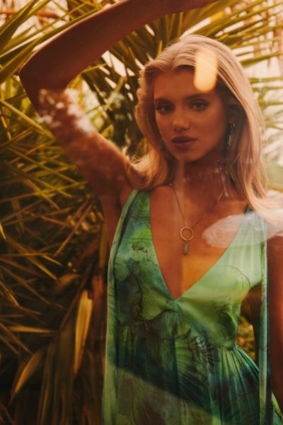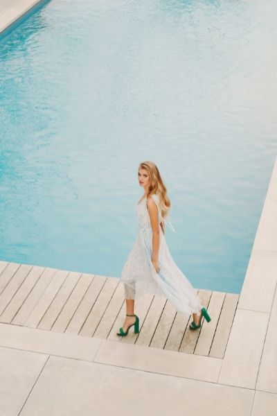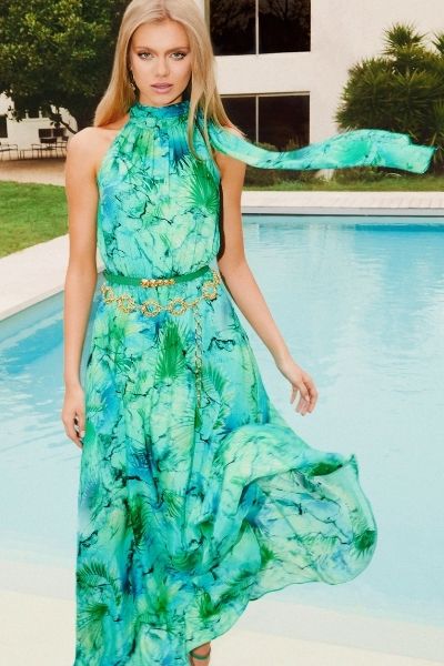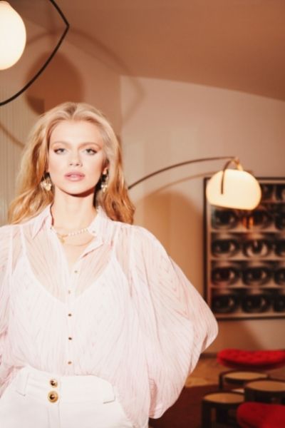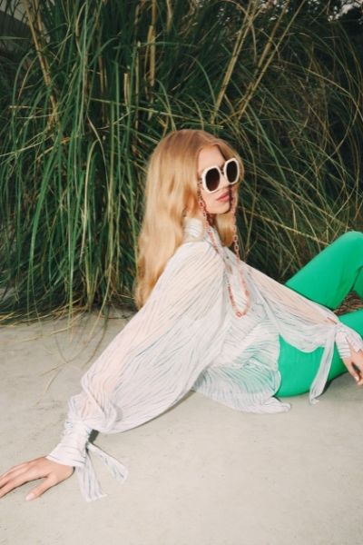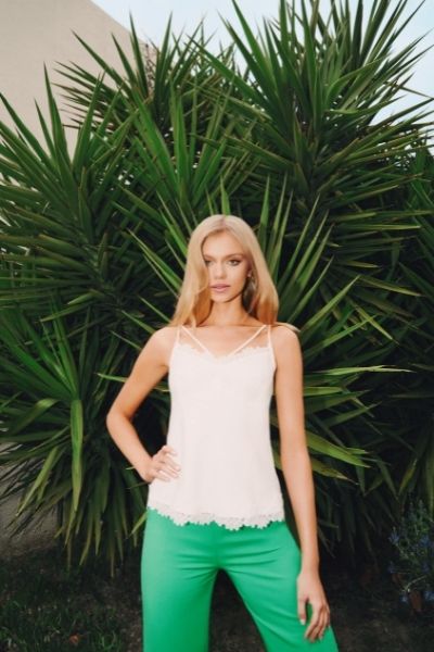 Z tego samego jedwabiu co suknia, uszyto również bluzkę z przepięknymi detalami: ozdobnymi guzikami i wiązaniami przy mankietach. Doskonałym jej uzupełnieniem są zarówno zielone spodnie od garnituru, jak również białe spodnie w kant. Wśród nasyconych soczystych zieleni wyróżnia się też koralowa sukienka z efektownym wiązaniem podkreślającym talię. Kolekcję uzupełniają akcesoria: skórzane torebki i paski, szpilki, sandałki na obcasie oraz biżuteria z naturalnych kamieni i pereł.