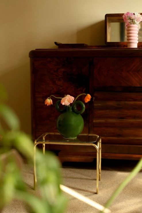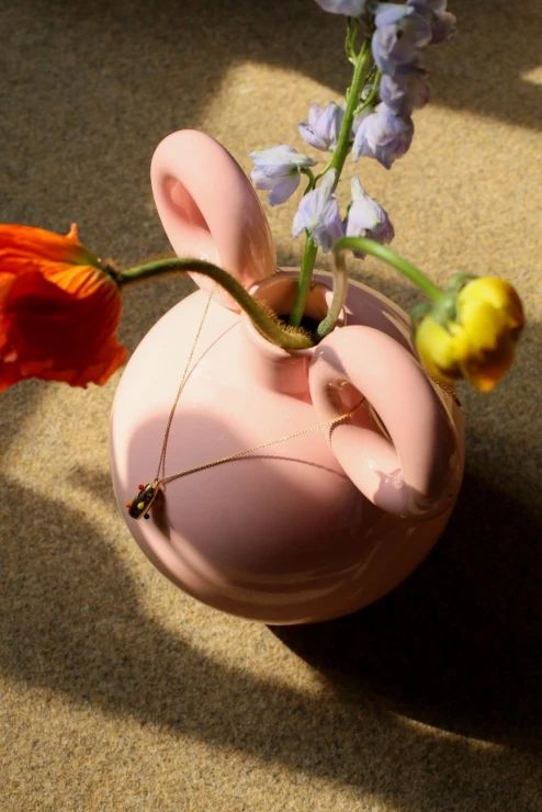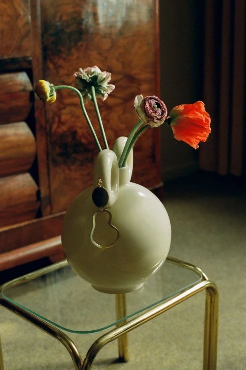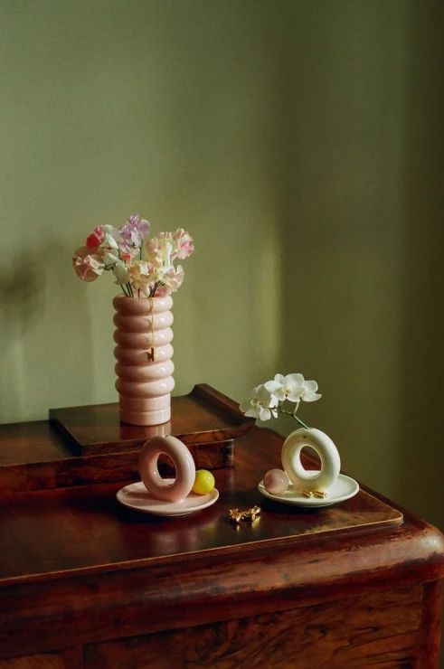 Pękaty wazon Irena w trzech kolorach – zieleni, pastelowym różu i beżu – posiada pokaźnych rozmiarów „uszy”, ozdobione kolczykami w charakterystycznych organicznych kształtach. Powstała również mniejsza wersja podstawki na biżuterię Aniela w odcieniu złamanej bieli oraz różu.