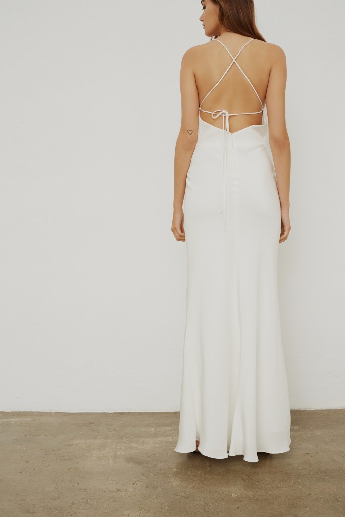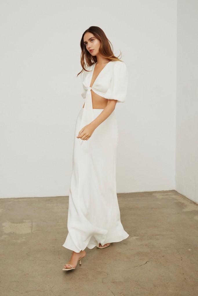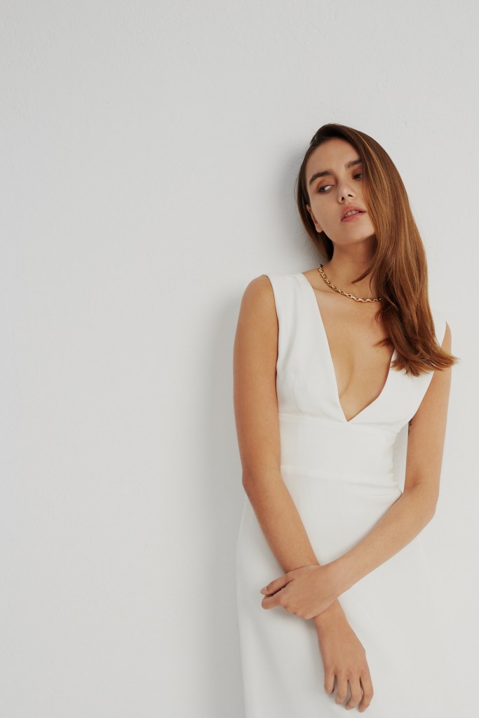 Nowa kolekcja ślubna Saintby to sześć modeli sukienek oraz jeden komplet składający się z wiązanego topu i długiej spódnicy. Kwintesencją projektów jest kobiecość, elegancja i minimalizm, elementy ponadczasowe i odporne na działanie sezonowych trendów. W kolekcji znalazły się zarówno klasyczne, jak i bardziej nieszablonowe projekty: sukienki z dekoltem typu woda na cienkich ramiączkach, zmysłowo odsłaniające plecy; dopasowane ołówkowe midi z gorsetową górą; czy wreszcie posągowe suknie do ziemi, subtelnie opływające sylwetkę. Na mniej zobowiązujące przyjęcie powstał komplet – wiązana z przodu bluzka z długim rękawem w połączeniu ze spódnicą maksi.