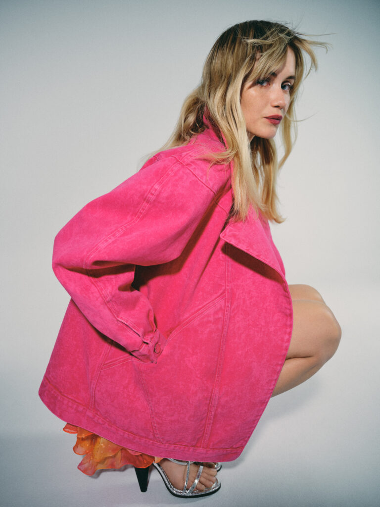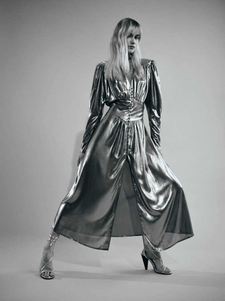 Lata 80. zostały wyeksponowane nie tylko za pomocą srebrnej tkaniny, z której uszyto komplet bluzy ze spodniami oraz sukienkę o kroju retro. Równie imponująca jest denimowa kurtka o przeskalowanym kroju, z praktycznymi kieszeniami w intensywnym różowym kolorze, nawiązująca do mody vintage.