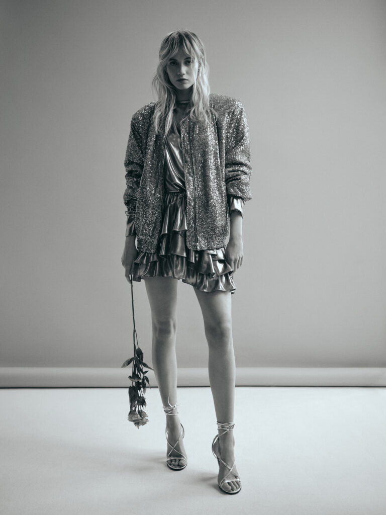 Kolekcja na wiosnę i lato to przede wszystkim sukienki z autorskim kwiatowym wzorem, intensywne kolory oraz metaliczny błysk. Dziewczęce falbanki zostają przełamane seksownym dekoltem i mocnymi ramionami, srebrne cekiny doskonale współgrają z pudełkowym fasonem kurtki, a skórzana bomberka wyglądająca jak podkradziona chłopakowi, sprawdzi się zarówno do dżinsów, jak i zwiewnej sukienki.