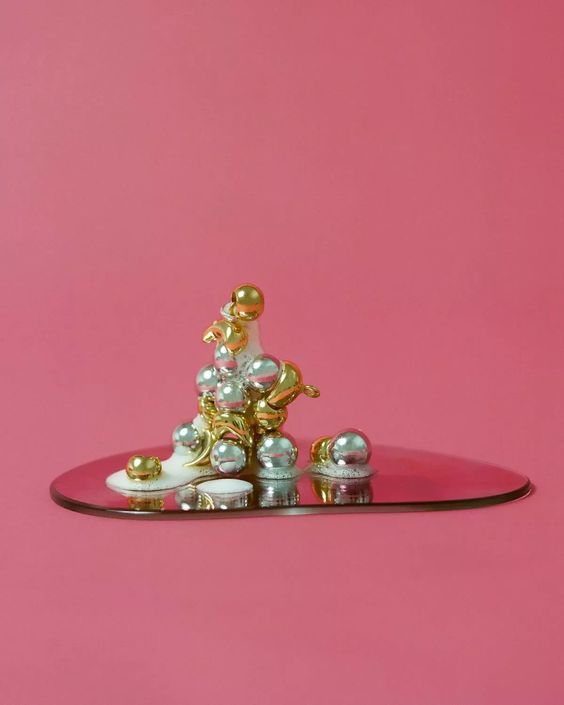 Pomysł na nową kolekcję KOPI dojrzewał w projektantce od sześciu lat. Srebrne kule w połączeniu ze złotymi nieregularnymi elementami to ukłon w stronę twórczości artysty Jeana Arpa, jak również estetyki y2k.