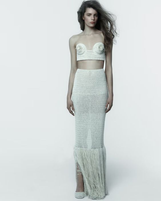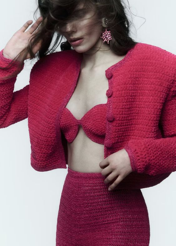 Magda Butrym ponownie sięga po charakterystyczne elementy nawiązujące do mody przełomu lat 80. i 90. Do jej ulubionych obcisłych sukienek i garniturów z szerokimi ramionami dołączają tym razem seksowne body z asymetrycznym wycięciem, bandażowe sukienki eksponujące ciało oraz pudełkowe żakiety, tym razem wykonane ręcznie na szydełku.