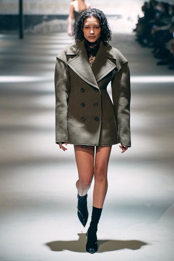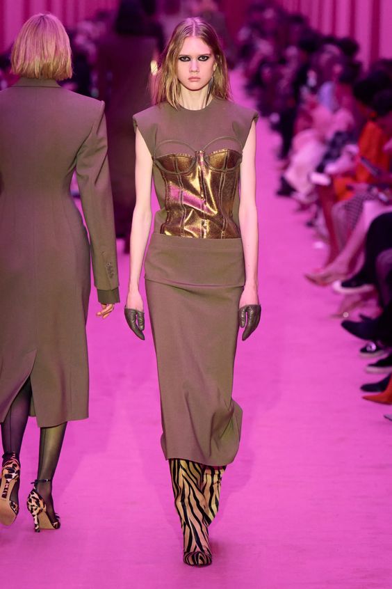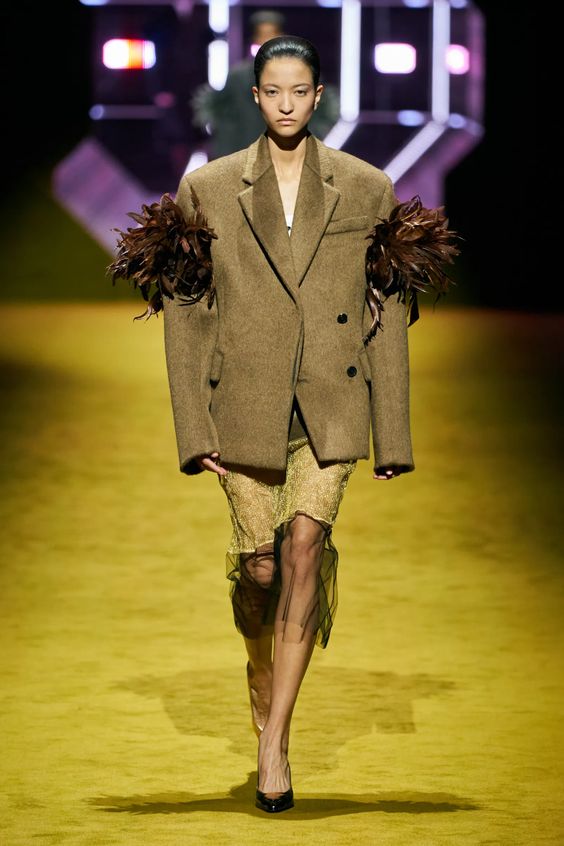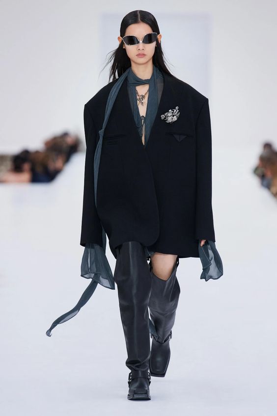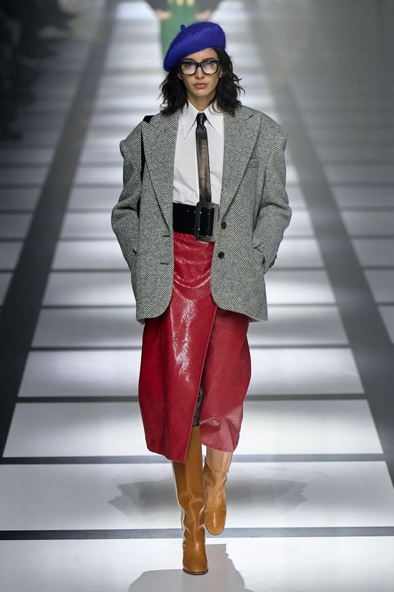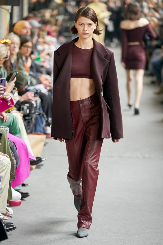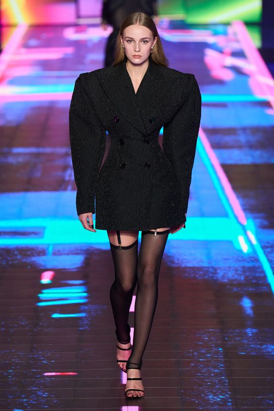 Lata 80. i przeskalowane ramiona w marynarkach nadal pozostają jednym z wiodących nurtów w modzie. Teraz łączymy je z elementami stylu y2k – ultra krótkimi spódniczkami, legginsami czy spodniami z obniżoną talią. Nowością są marynarki i płaszcze z mocno zarysowaną linią ramion i wcięciem w talii.