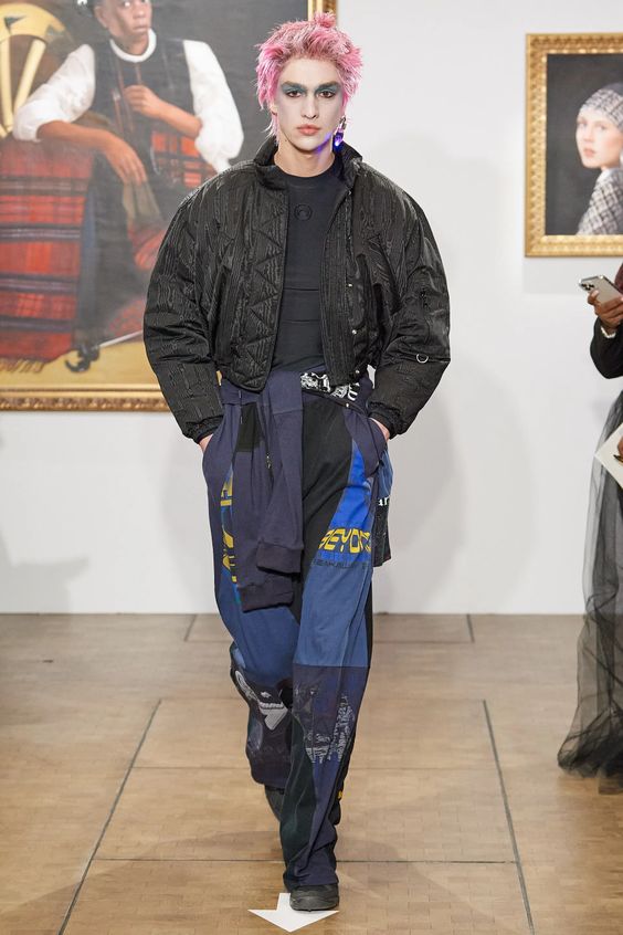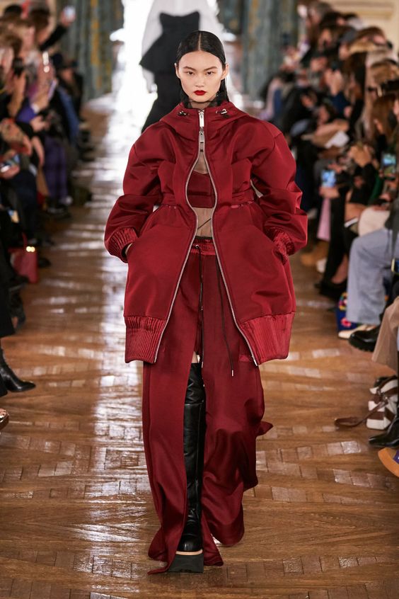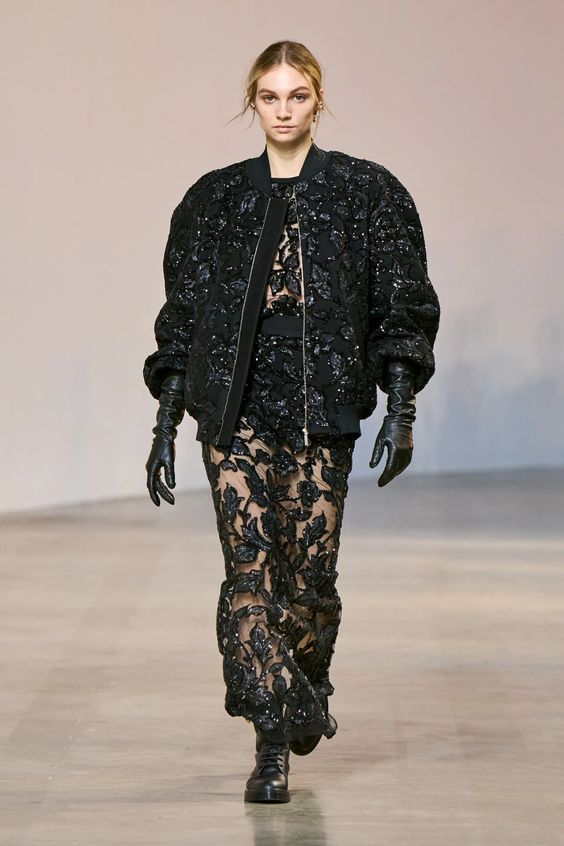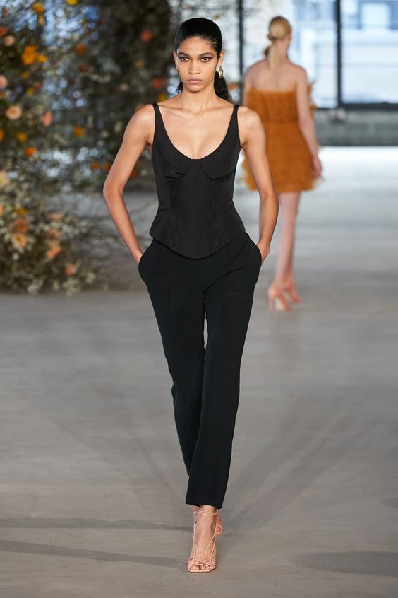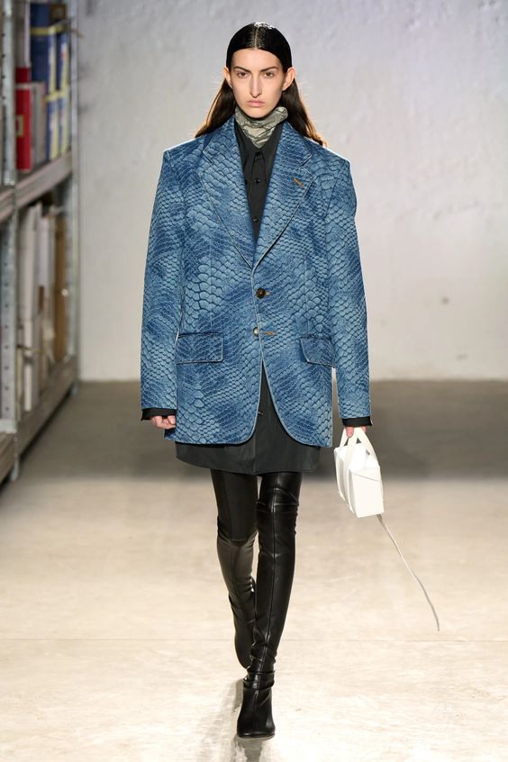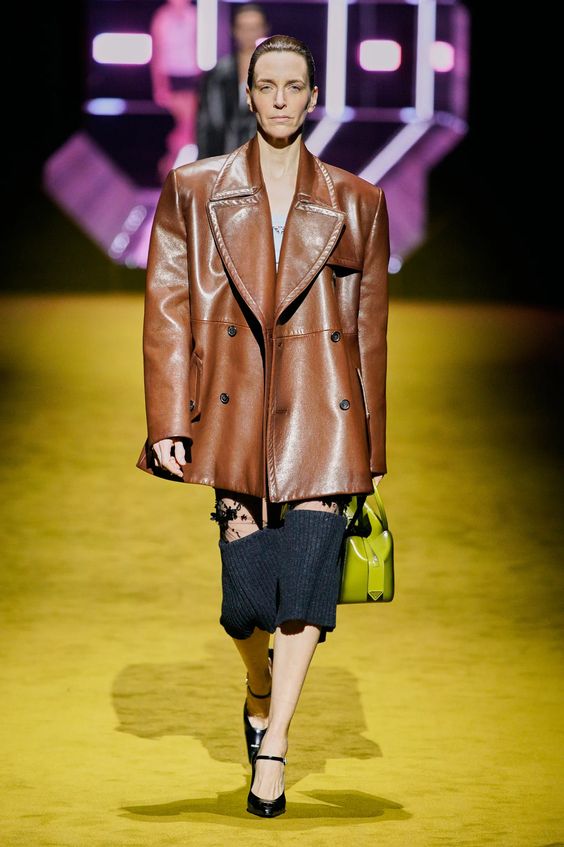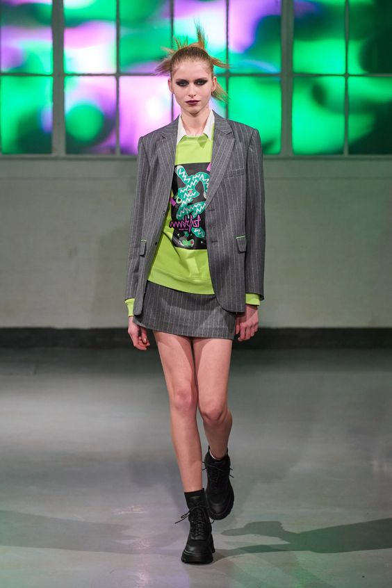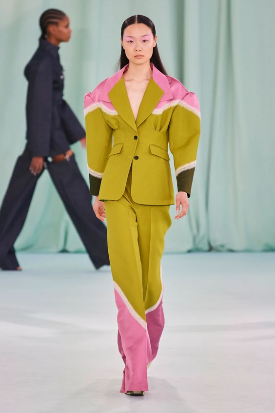 Lata 80. i przeskalowane ramiona w marynarkach nadal pozostają jednym z wiodących nurtów w modzie. Teraz łączymy je z elementami stylu y2k – ultra krótkimi spódniczkami, legginsami czy spodniami z obniżoną talią. Nowością są marynarki i płaszcze z mocno zarysowaną linią ramion i wcięciem w talii.
