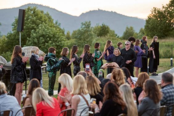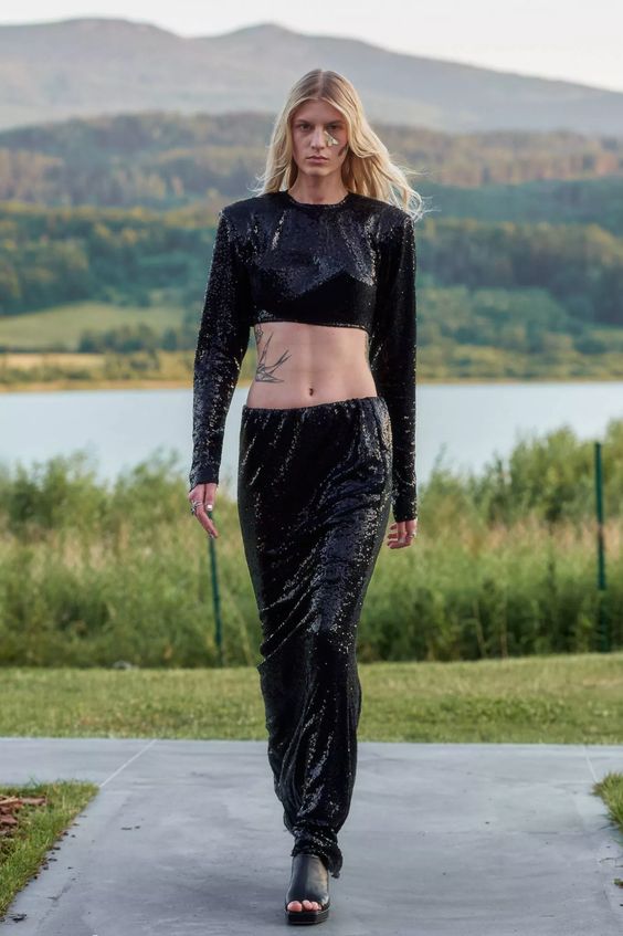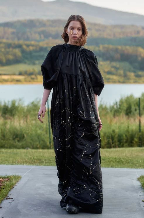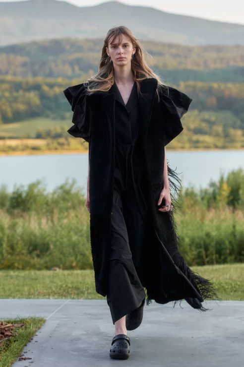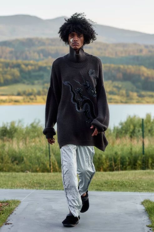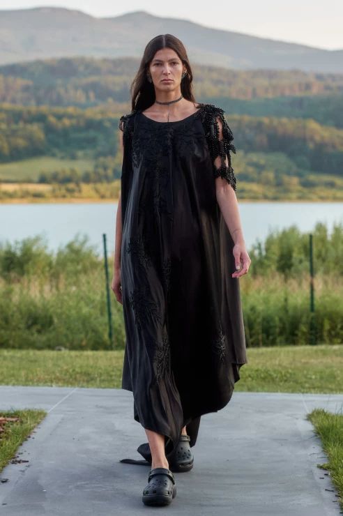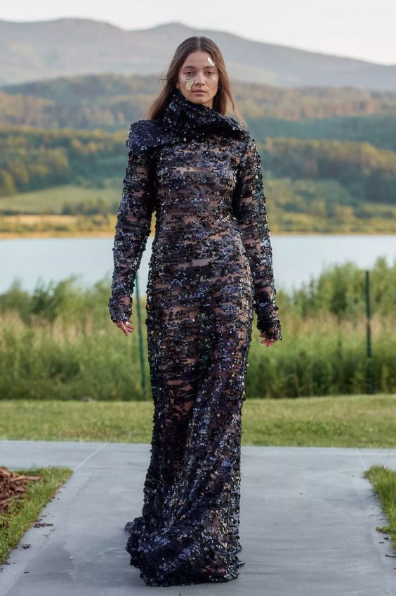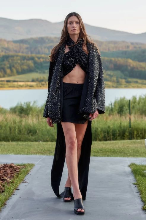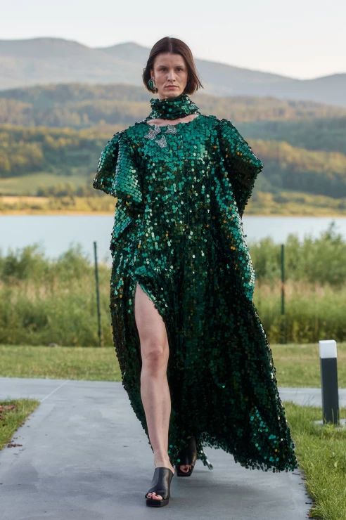 Sama kolekcja to hołd dla miejsca, w którym odbył się pokaz – jest integralna z otaczającym krajobrazem, wtapiająca się w taflę jeziora, zieleń lasów i majaczące w oddali mroczne szczyty gór. Kolorystyka oraz zastosowane materiały doskonale oddają ten zamysł – przeskalowane cekiny migoczą jak promienie słońca na powierzchni wody, ciemna butelkowa zieleń i fiolet imitują kolory nieba o zachodzie słońca, a wszystkie odcienie czerni oddają tajemniczość gór.