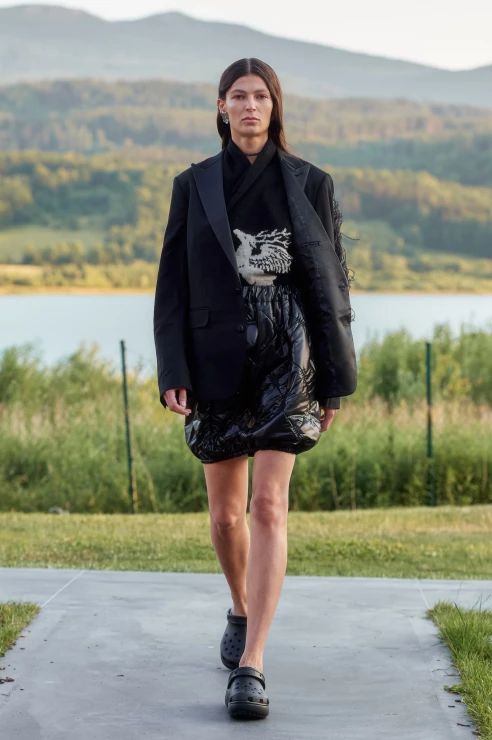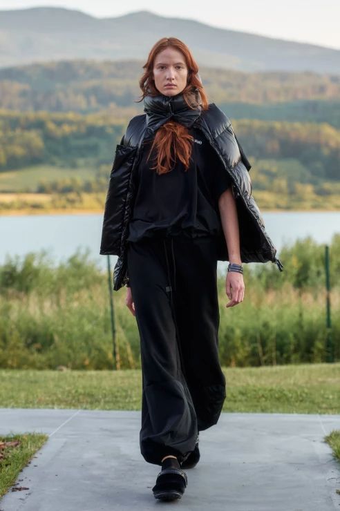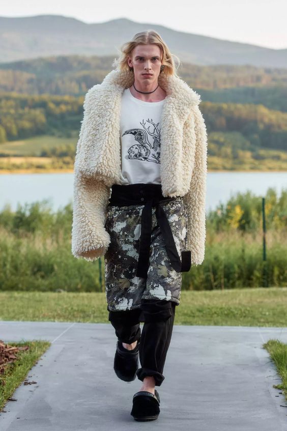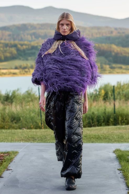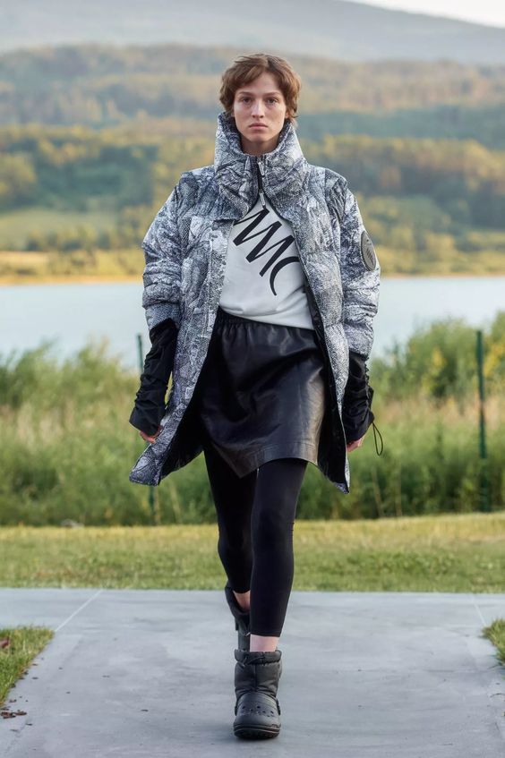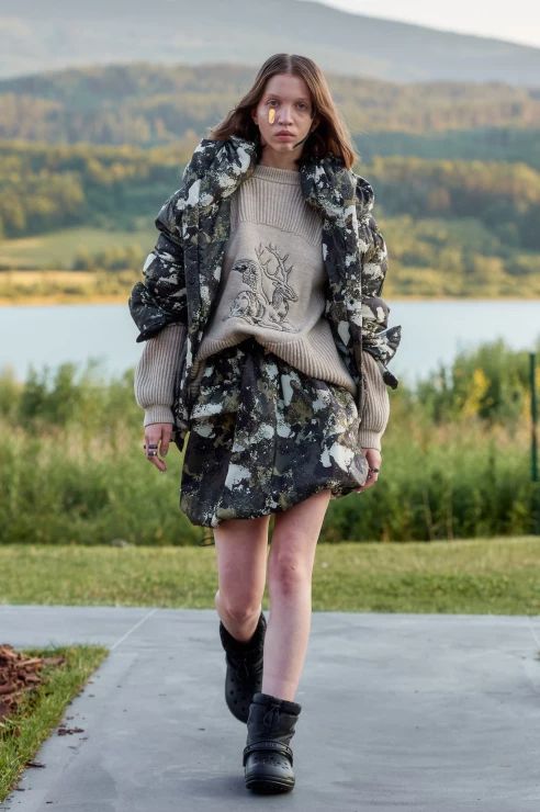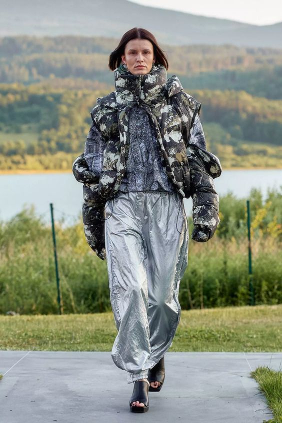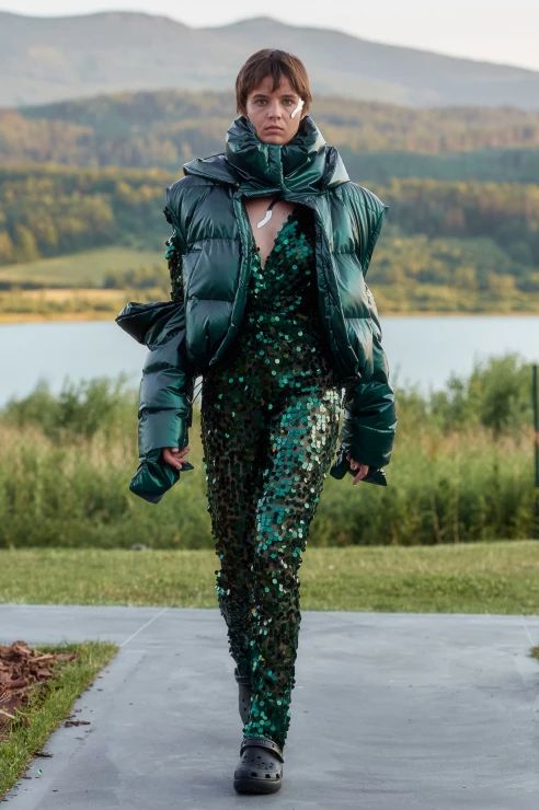 To tyle, jeśli chodzi o warstwę wizualną, bo samej mody spod znaku MMC jest tu również sporo. To w czym duet czuje się najlepiej to streetwear, i tym razem nie zawiedliśmy się. Obok cekinowych wieczorowych sukien pojawiły się puchowe kamizelki i kurtki z odpinanymi rękawami, pikowane spodnie i spódniczki, spodnie bojówki z obniżonym stanem, komplety z wzorem kamuflażu oraz kurtki z kożuszkiem. Przeskalowane płaszcze i bluzy obszyto przekornie piórami, a obszerne suknie-opończe zestawiono z crocsami.