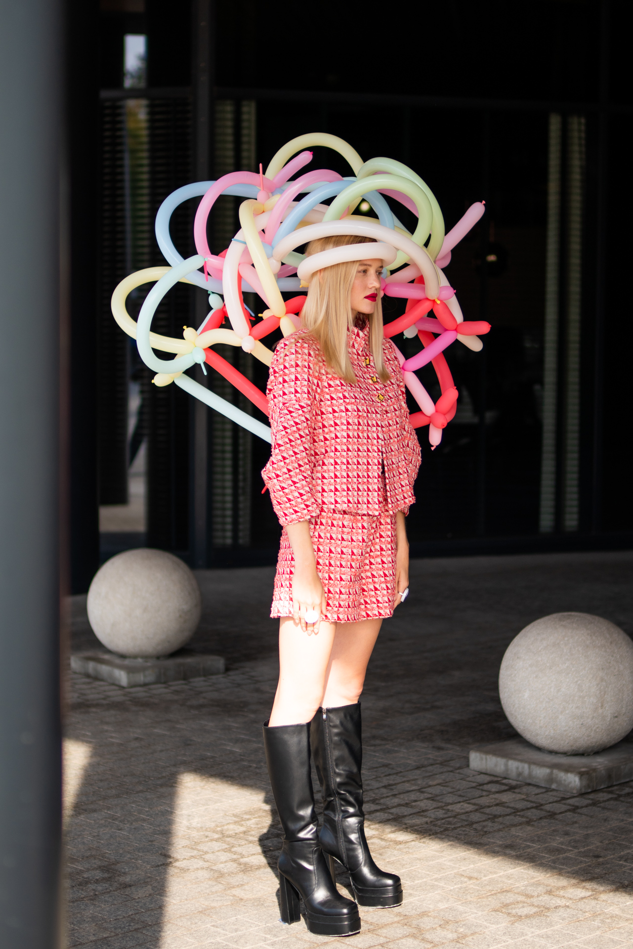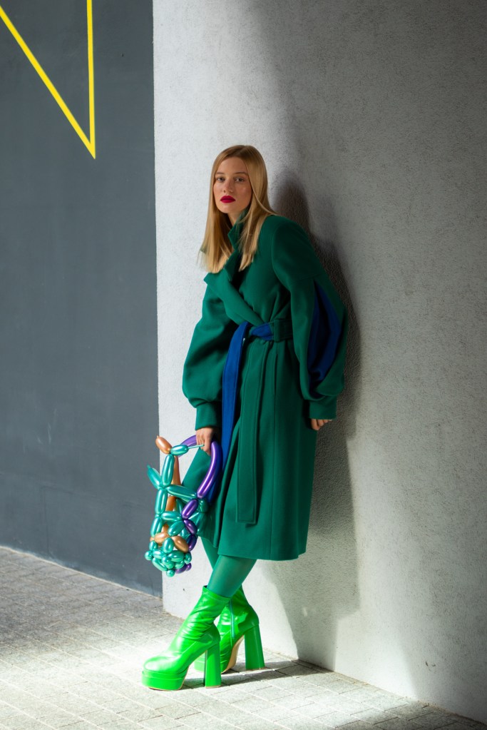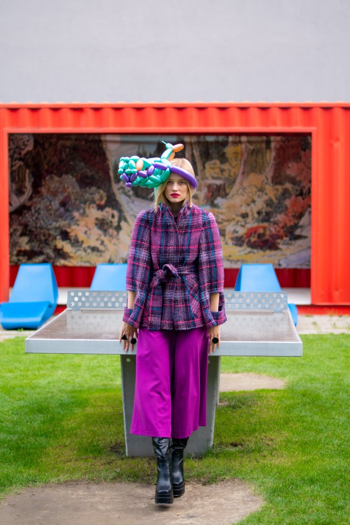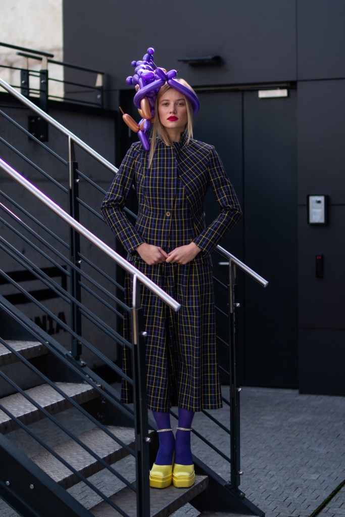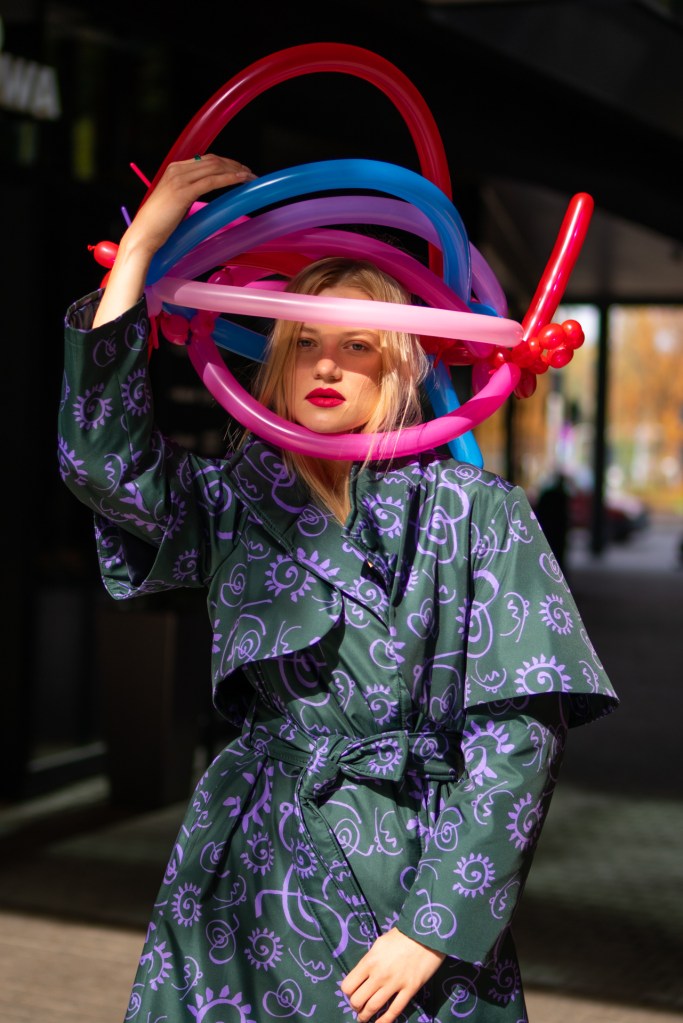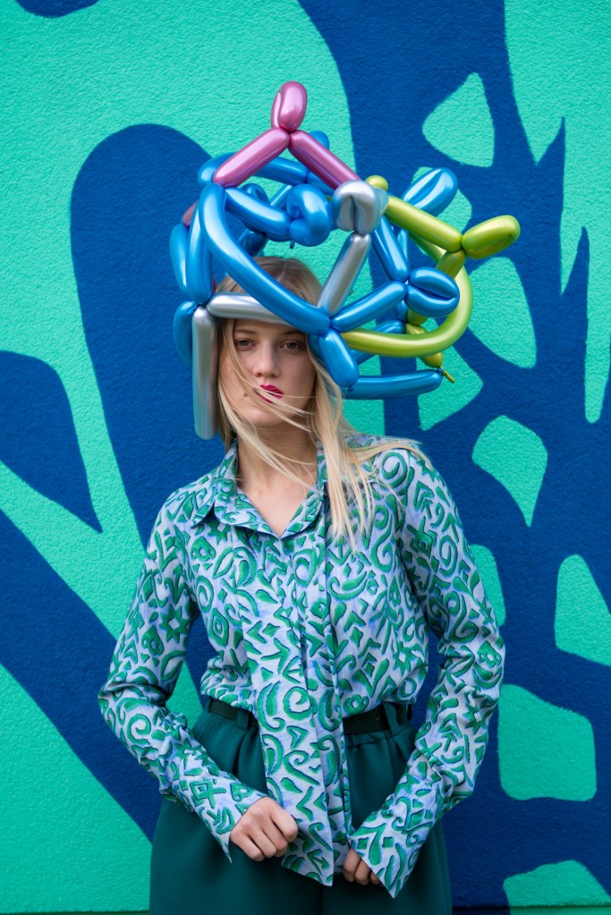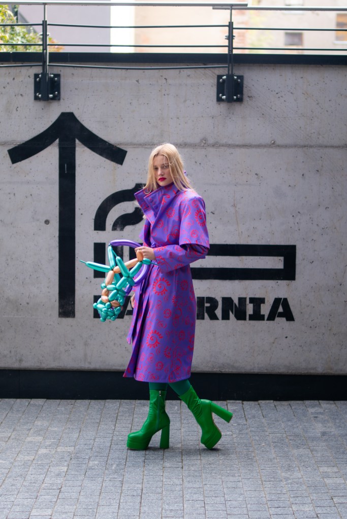 Kolekcja na jesień i zimę zawiera w sobie wszystkie te elementy. Efektowne płaszcze o klasycznym szlafrokowym kroju z pęknięciami na rękawach w kontrastowym kolorze, trencze z graficznymi nadrukami, kraciaste spodnie typu culottes zestawione z koszulami z nadrukiem w stylu lat 70., sukienki w psychodeliczny wzór z bufiastym rękawem czy wreszcie grzeczne komplety z tkaniny boucle (czy to subtelne nawiązanie do nazwy marki?). A wszystko to zestawione na przekór z ciężkimi butami na masywnej platformie, kolorowymi rajstopami i akcesoriami… z balonów.