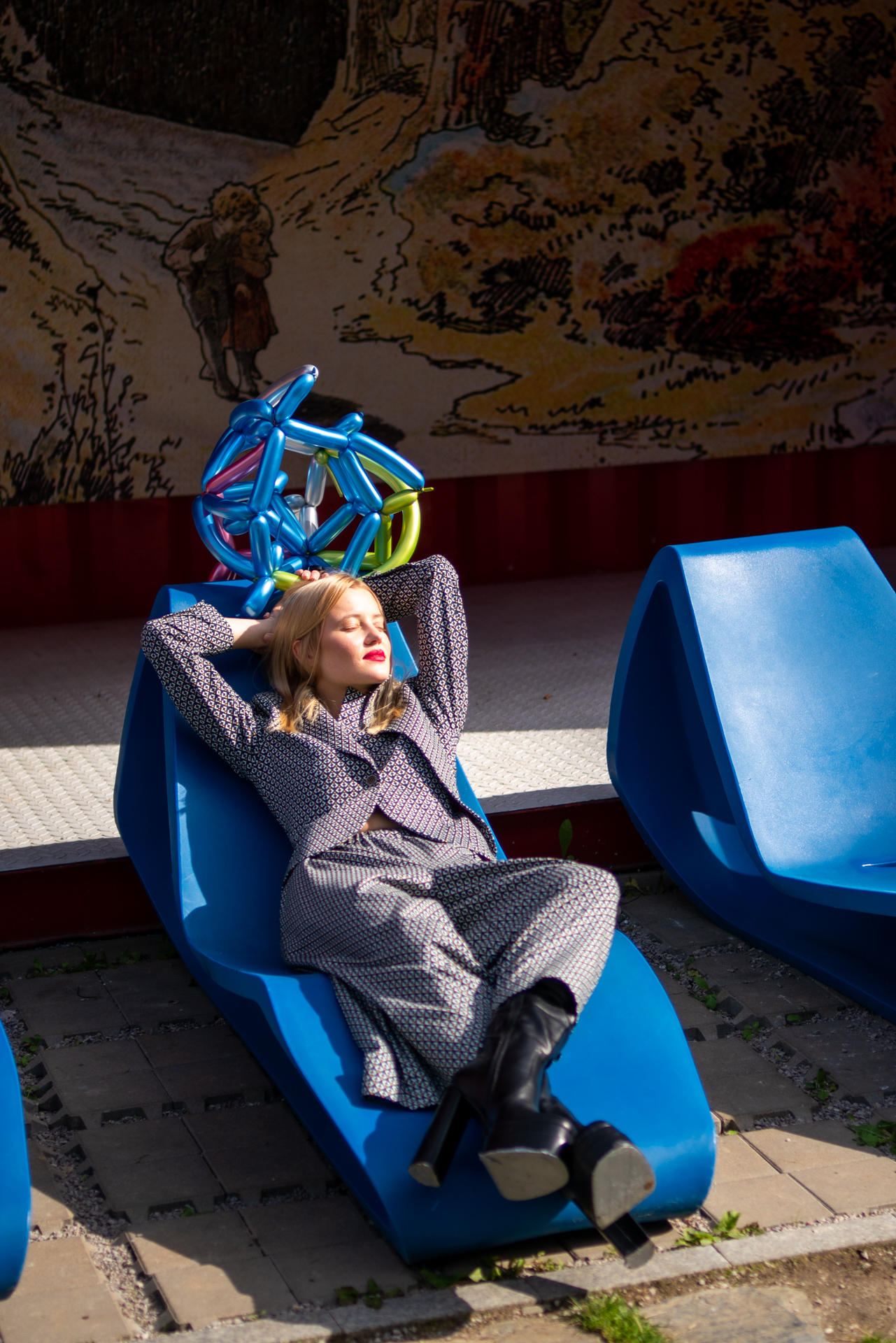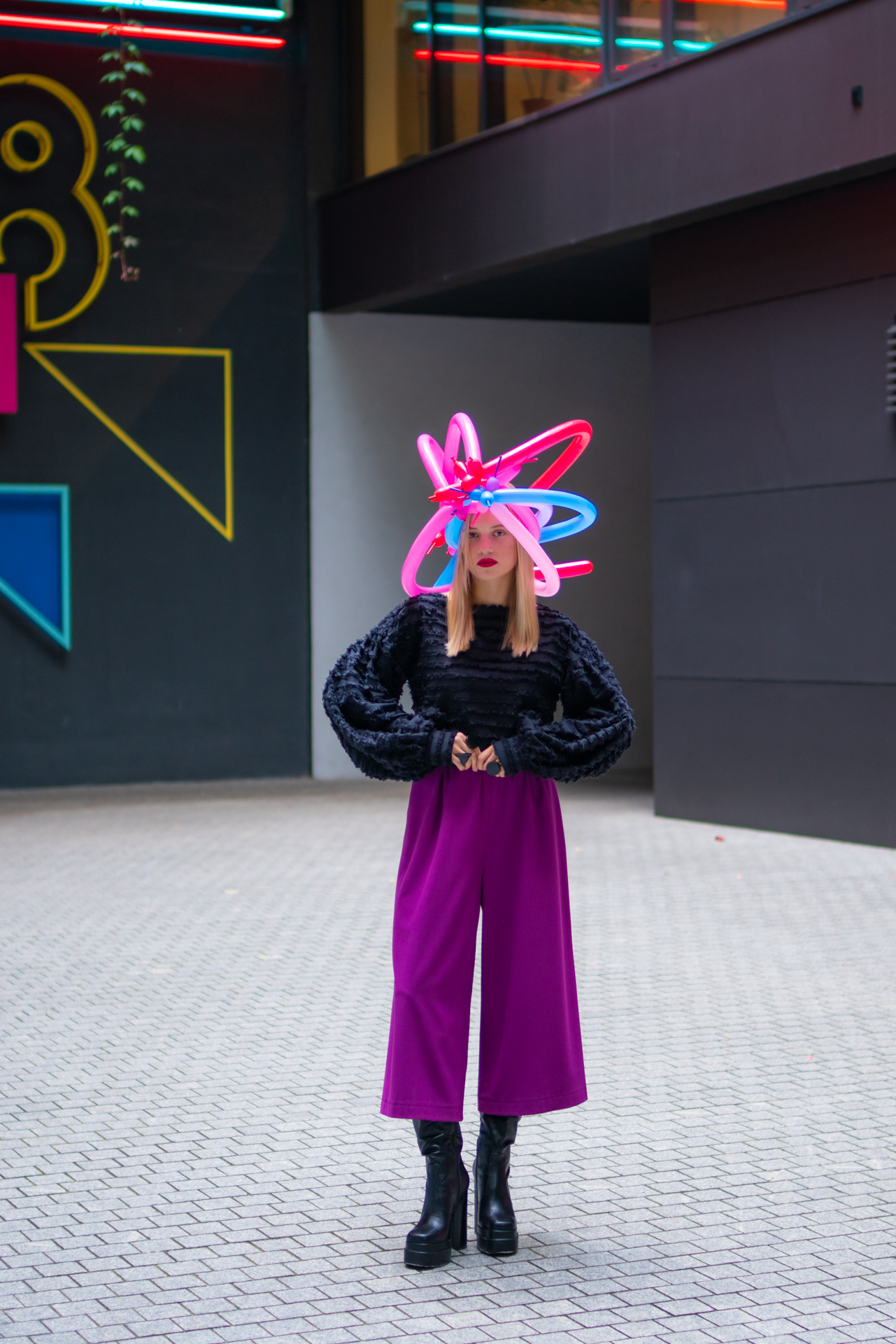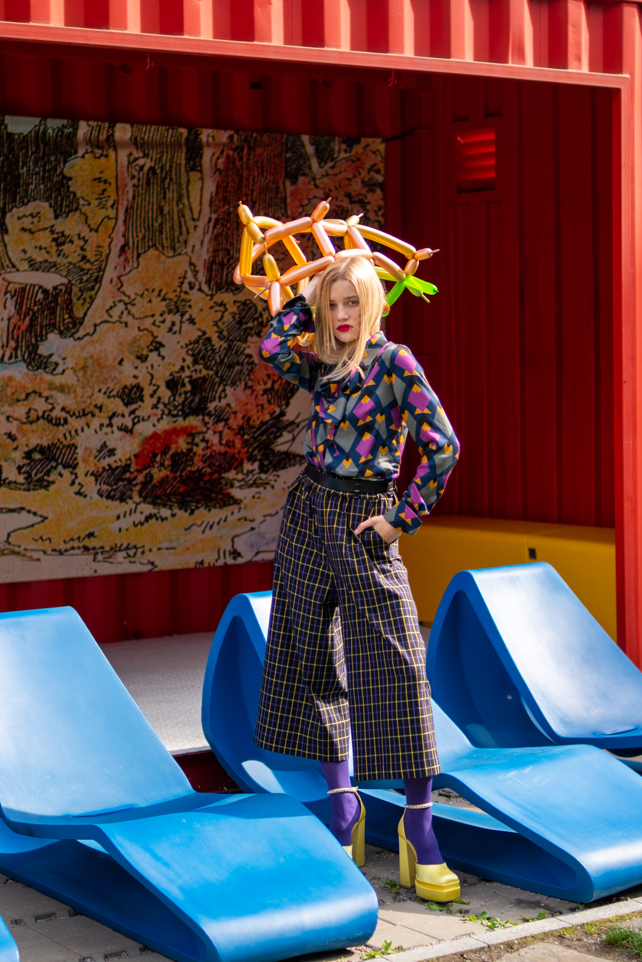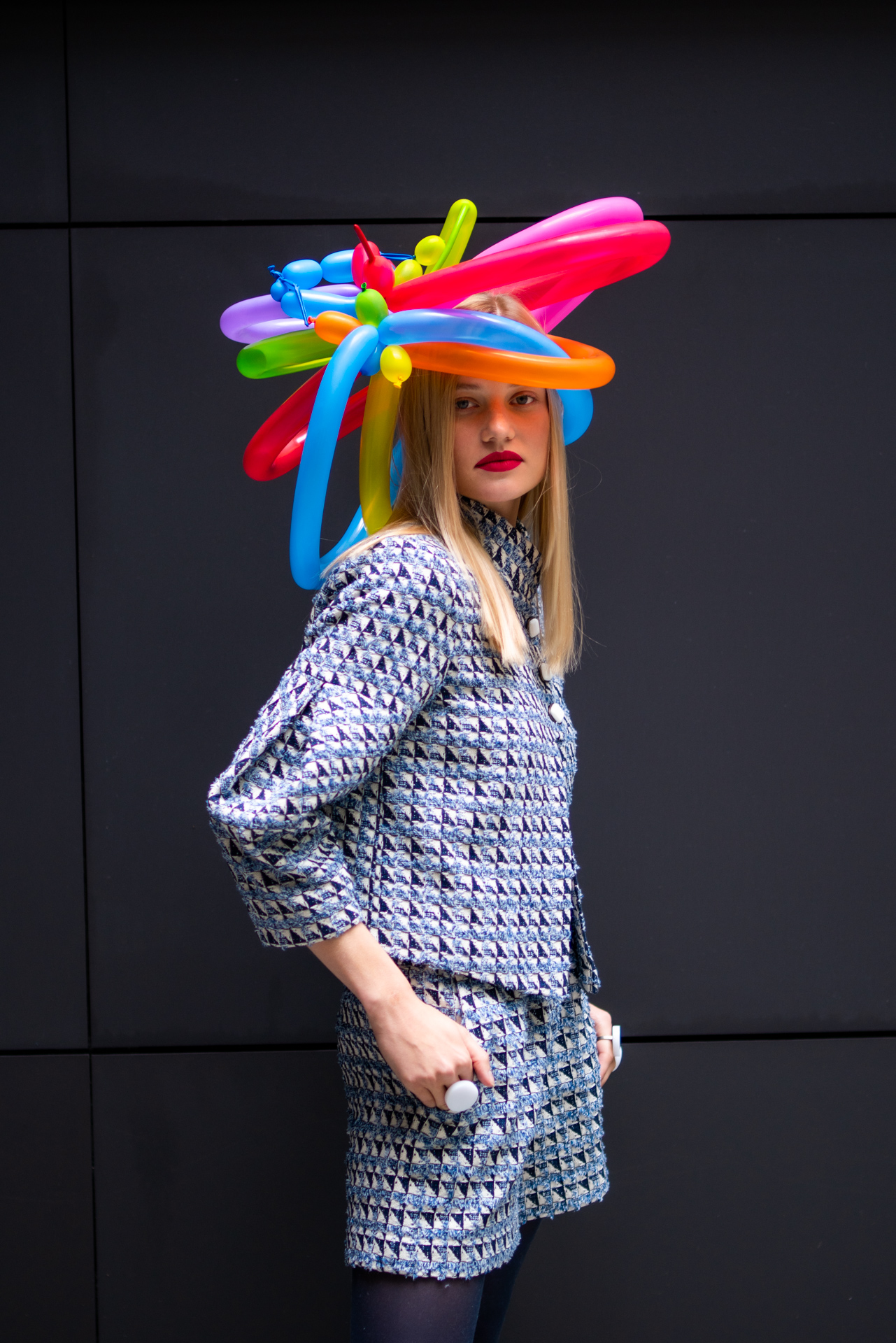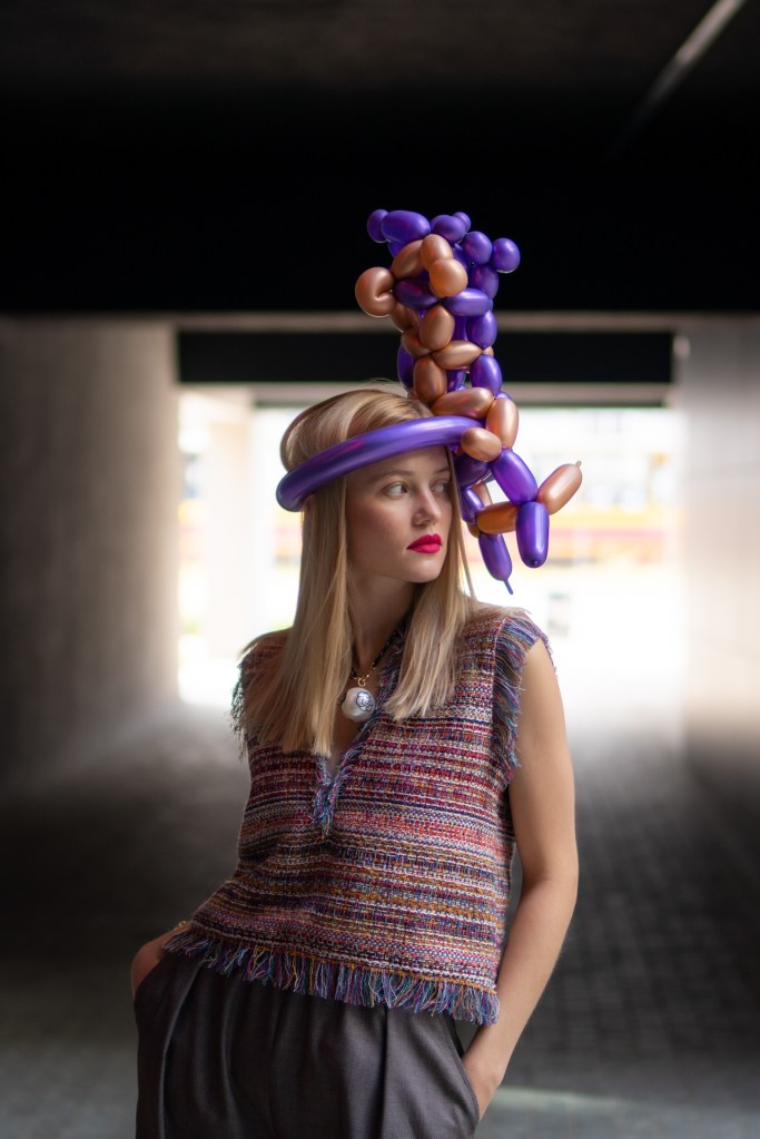 Kolekcja na jesień i zimę zawiera w sobie wszystkie te elementy. Efektowne płaszcze o klasycznym szlafrokowym kroju z pęknięciami na rękawach w kontrastowym kolorze, trencze z graficznymi nadrukami, kraciaste spodnie typu culottes zestawione z koszulami z nadrukiem w stylu lat 70., sukienki w psychodeliczny wzór z bufiastym rękawem czy wreszcie grzeczne komplety z tkaniny boucle (czy to subtelne nawiązanie do nazwy marki?). A wszystko to zestawione na przekór z ciężkimi butami na masywnej platformie, kolorowymi rajstopami i akcesoriami… z balonów.