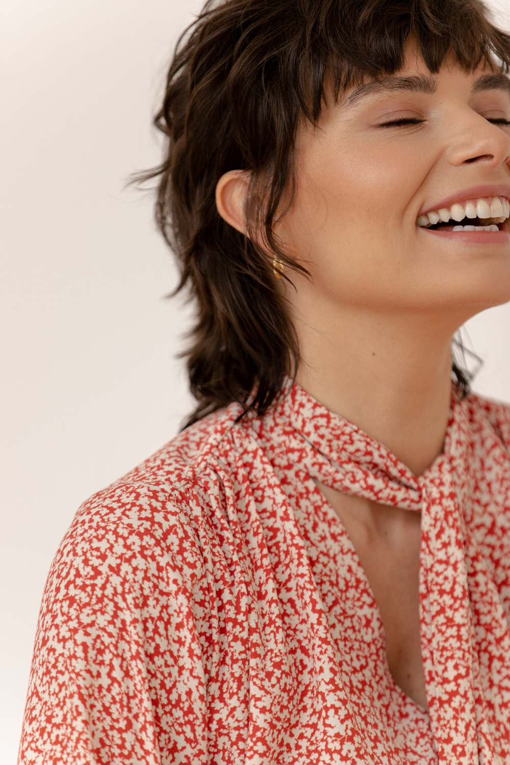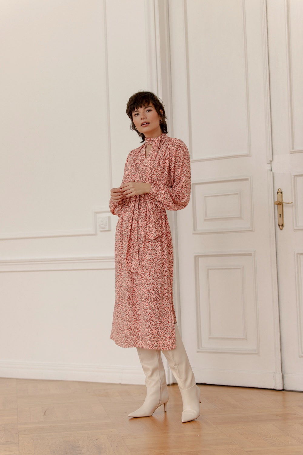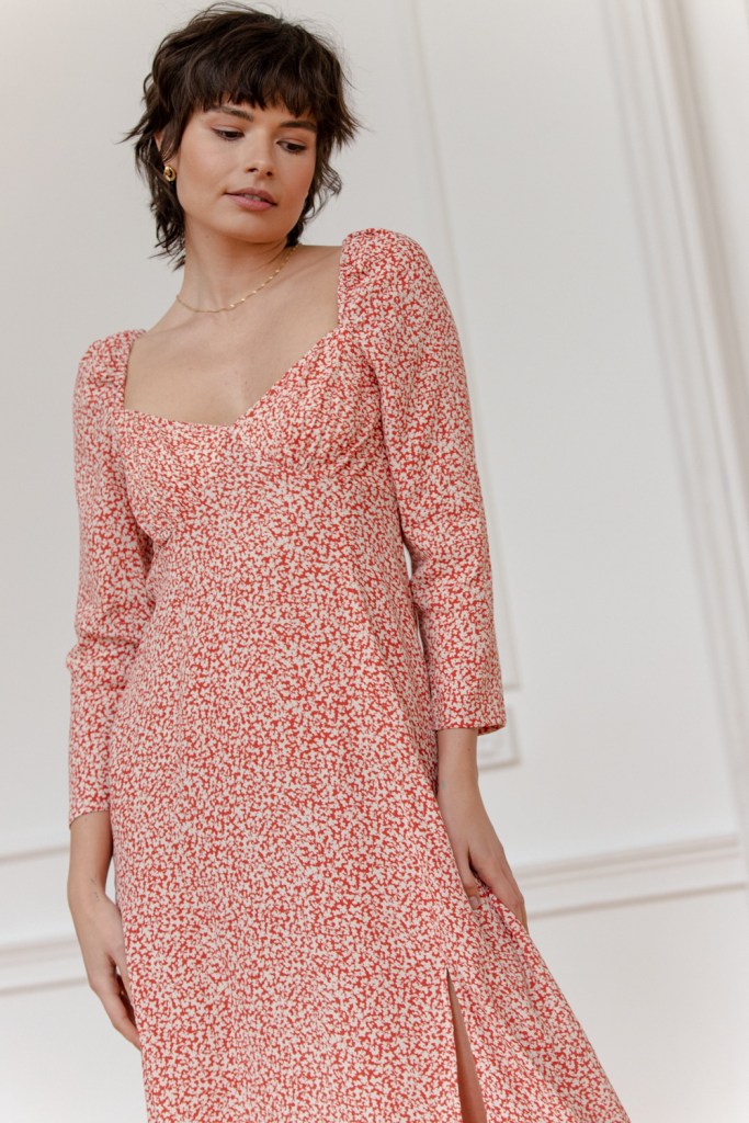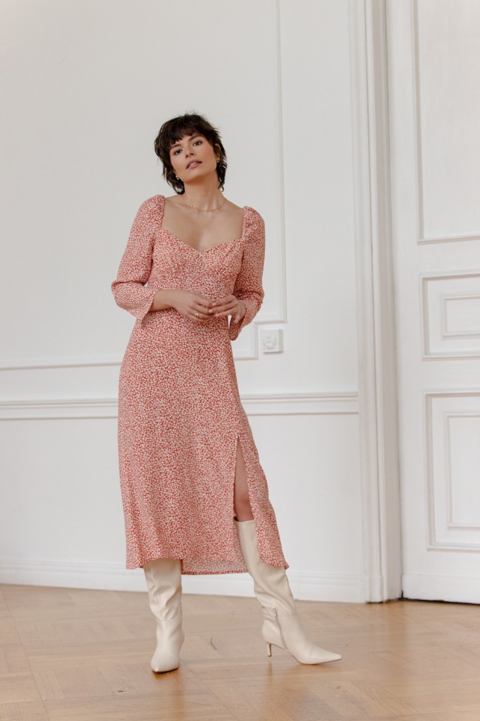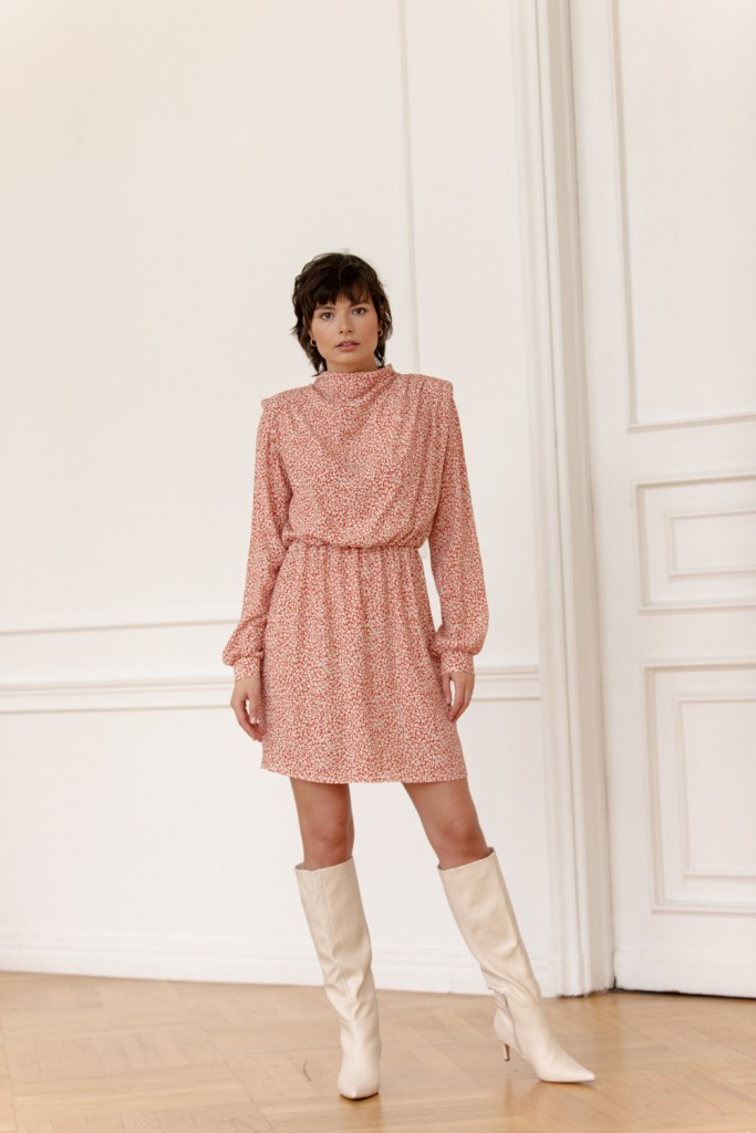 W tym sezonie osią kolekcji jest drobny kwiatowy wzór, który pojawia się na kilku modelach sukienek. Subtelny deseń w ceglasto-kremowym kolorze nawiązuje do stylu romantycznego i estetyki vintage. Wśród fasonów sukienek znajdują się zarówno mocno zaznaczone ramiona i długość midi w stylu lat 80., jak również swobodny krój sięgający za kolano, z dekoltem karo lub z dekoracyjną szarfą – do zawiązania na szyi albo nonszalanckiego puszczenia jej luzem.