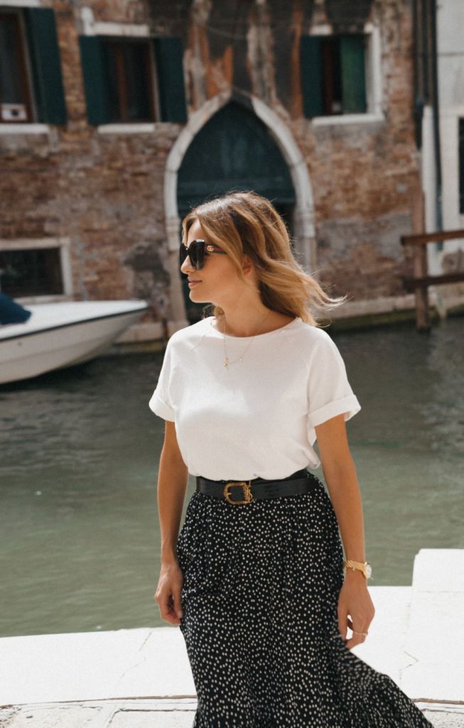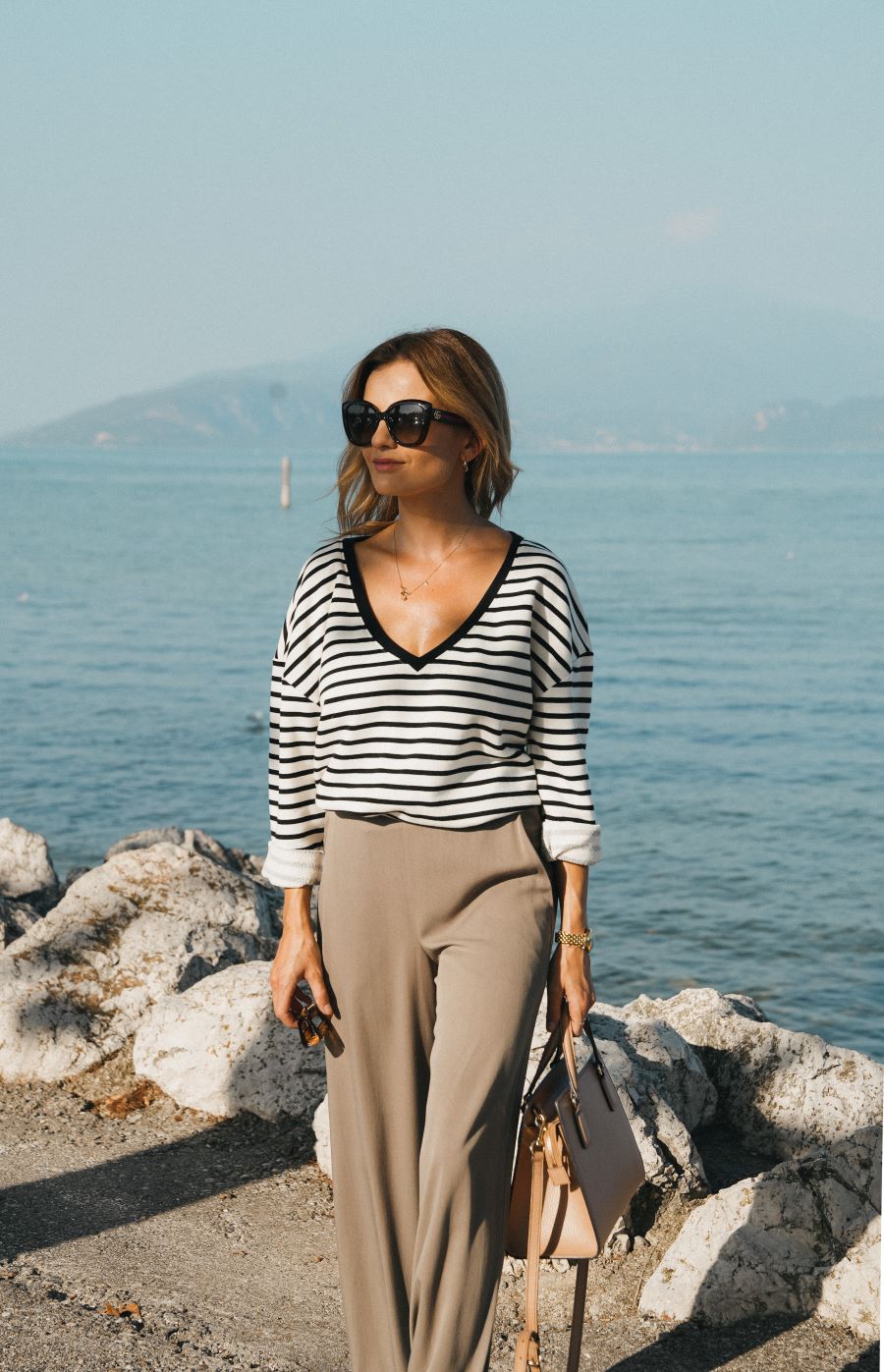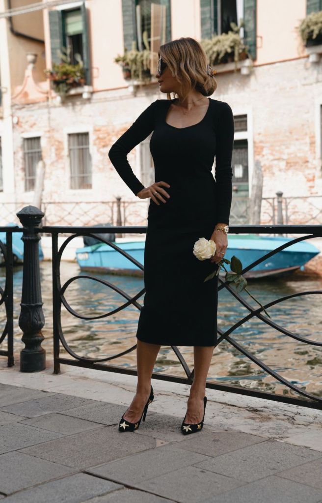 Kolejnymi elementami kolekcji, które stanowią jej podstawę, są bluzka typu longsleeve w paski inspirowana tradycyjnym strojem gondolierów oraz dopasowana czarna sukienka przed kolano. Te elementy to doskonała baza do budowania wokół nich stylizacji przy pomocy dodatków. Bez wysiłku można uzyskać look o charakterze casualowym czy bardziej eleganckim, dobierając odpowiednie buty, torebkę i marynarkę lub skórzaną kurtkę.