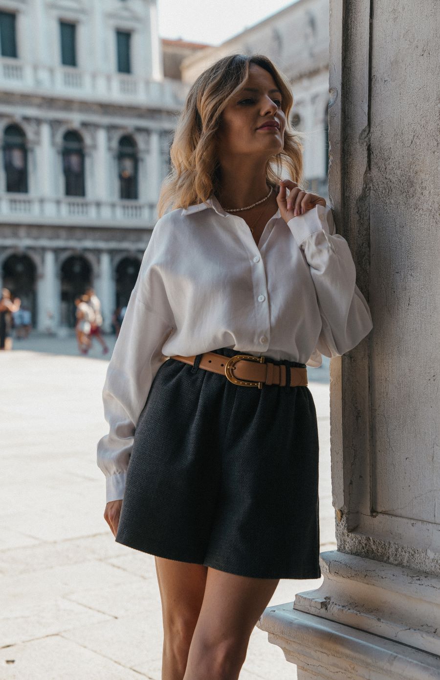 Z tej samej tkaniny co kwiecista koszula, powstała również sukienka z falbaną – do noszenia z paskiem lub bez. Na wakacjach stworzy letni i zwiewny look, zimą sprawdzi się w warstwowych stylizacjach z ciepłym swetrem i kowbojkami. Marynarka o eleganckim dwurzędowym kroju została uszyta z wysokiej jakości wełny z bawełnianą domieszką. Z tego samego materiału powstały szorty z wysokim stanem. I tutaj także możemy nosić je w komplecie lub tworzyć dowolne kombinacje.