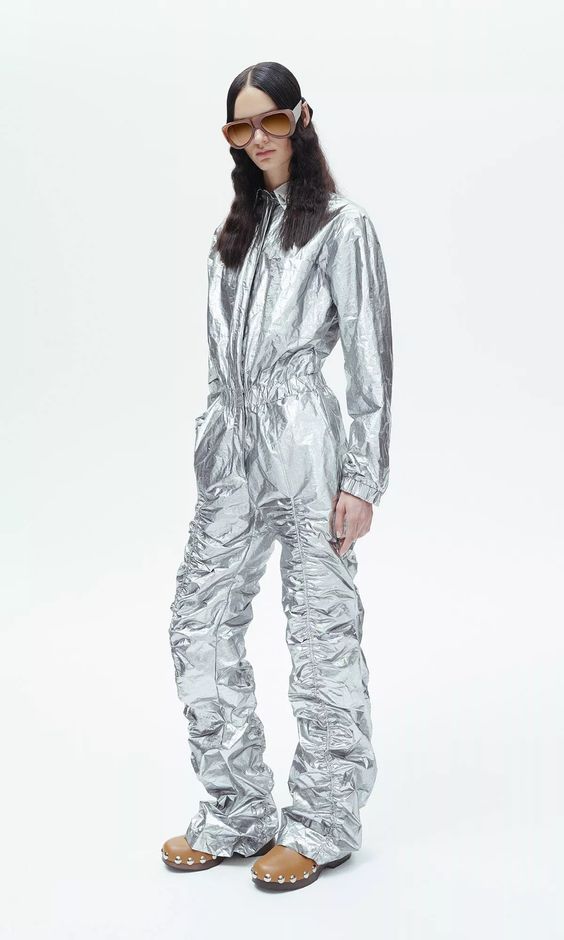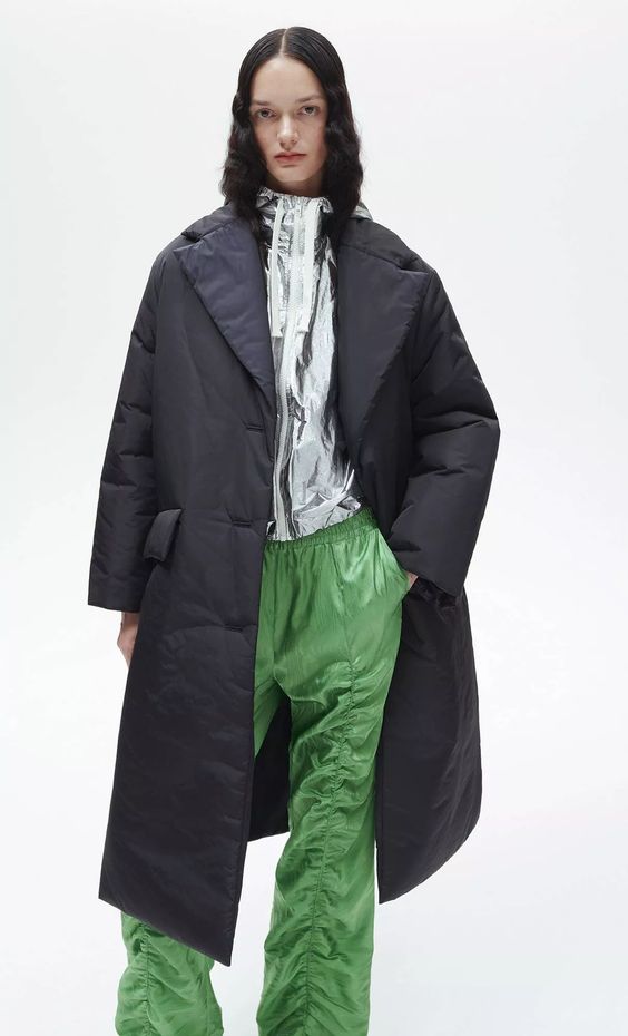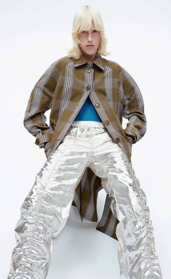 Im dalej, tym więcej szaleństwa. Marszczone spodnie i krótka kurtka z kapturem w kolorze metalicznego srebra to nawiązanie do ery space age i futurystycznych projektów Pierre’a Cardin. Można nosić je osobno, warstwowo, lub dla większego efektu – w komplecie. Albo nawet wybrać metaliczny kombinezon. Jest też coś dla zmarźluchów – puchowy płaszcz z ociepliną wykonany w minimalistycznej formie to świetna alternatywa dla klasycznych puchówek. Kolejną nowością są wzory: nostalgiczna kratka pojawiła się na trenczu i krótkiej kurtce typu bomber.