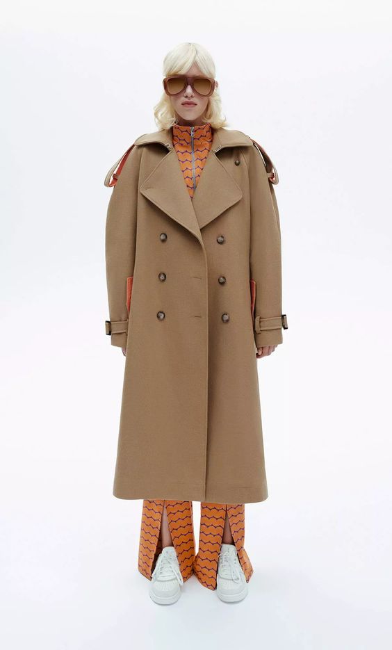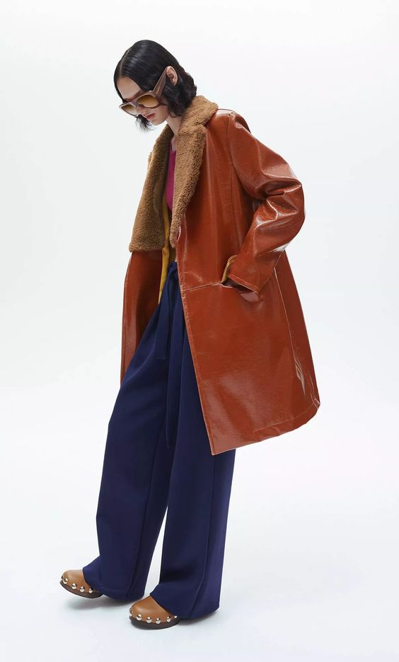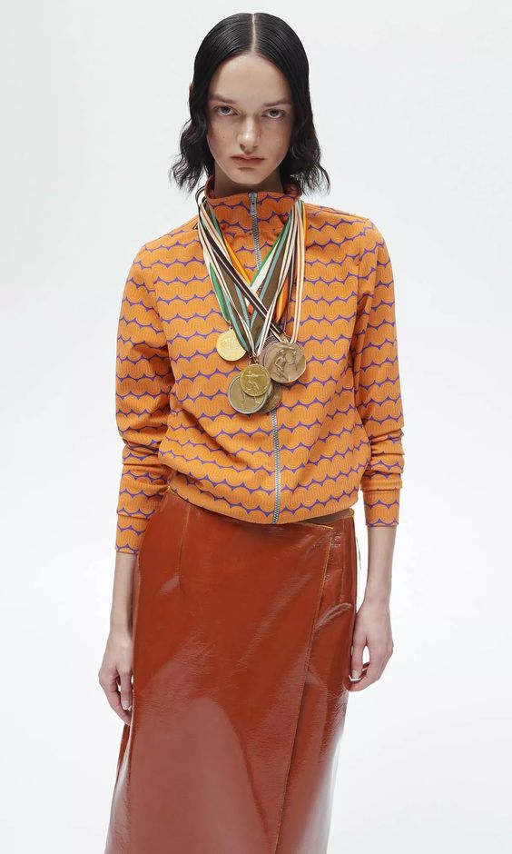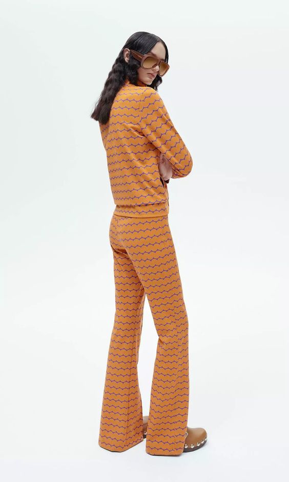 Największą uwagę przykuwają dwa płaszcze: lakierowany, ceglasty, z kołnierzem ze sztucznego futra oraz beżowy z szerokim wykładanym kołnierzem i kontrafałdą w kontrastowym pomarańczowym kolorze. Klasyczne fasony kojarzone silnie z latami 70. zyskały nowoczesny sznyt. Zaraz za nimi plasuje się pomarańczowy komplet – bluza z zamkiem błyskawicznym oraz spodnie z rozszerzaną nogawką i rozcięciem, w charakterystyczny wzór inspirowany znów latami 70.
