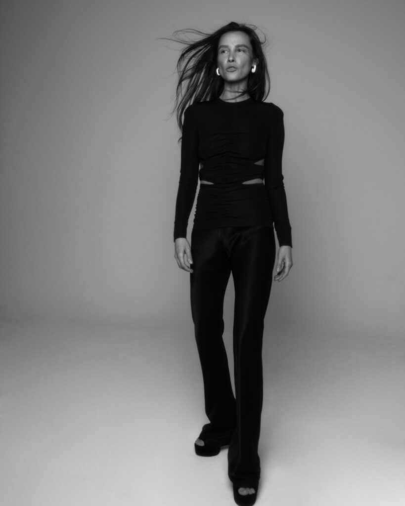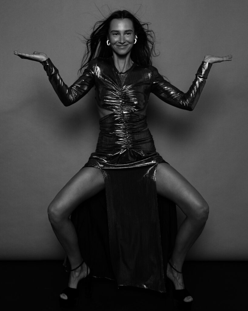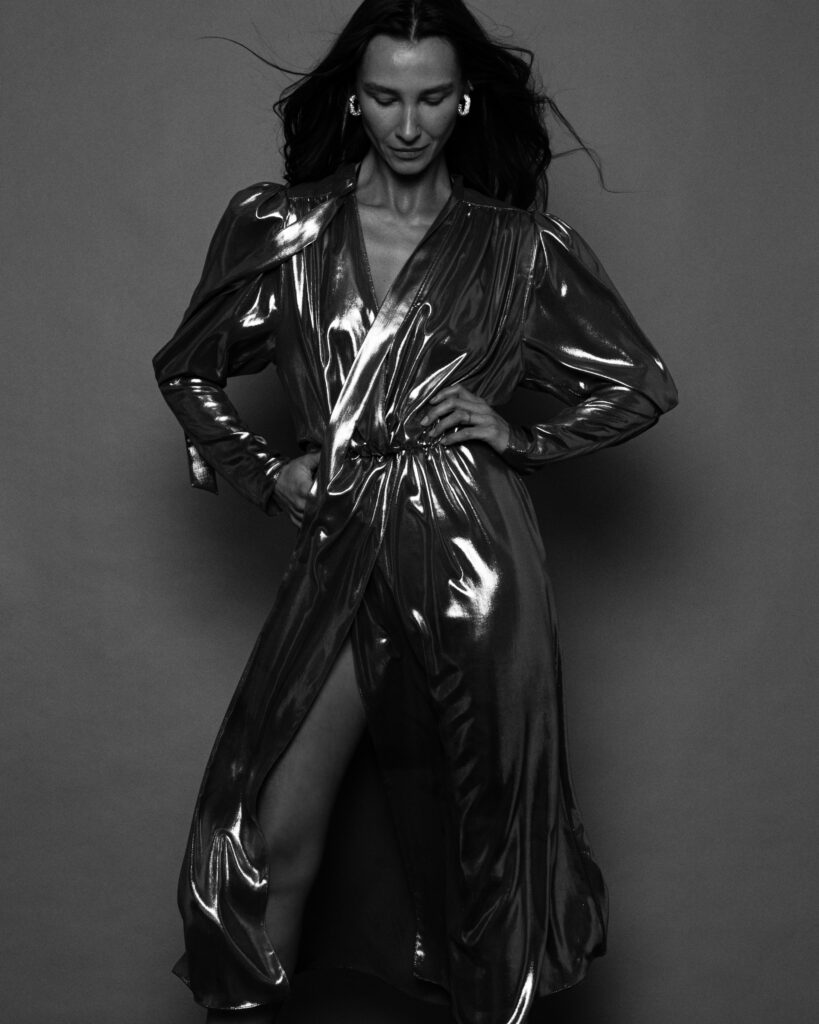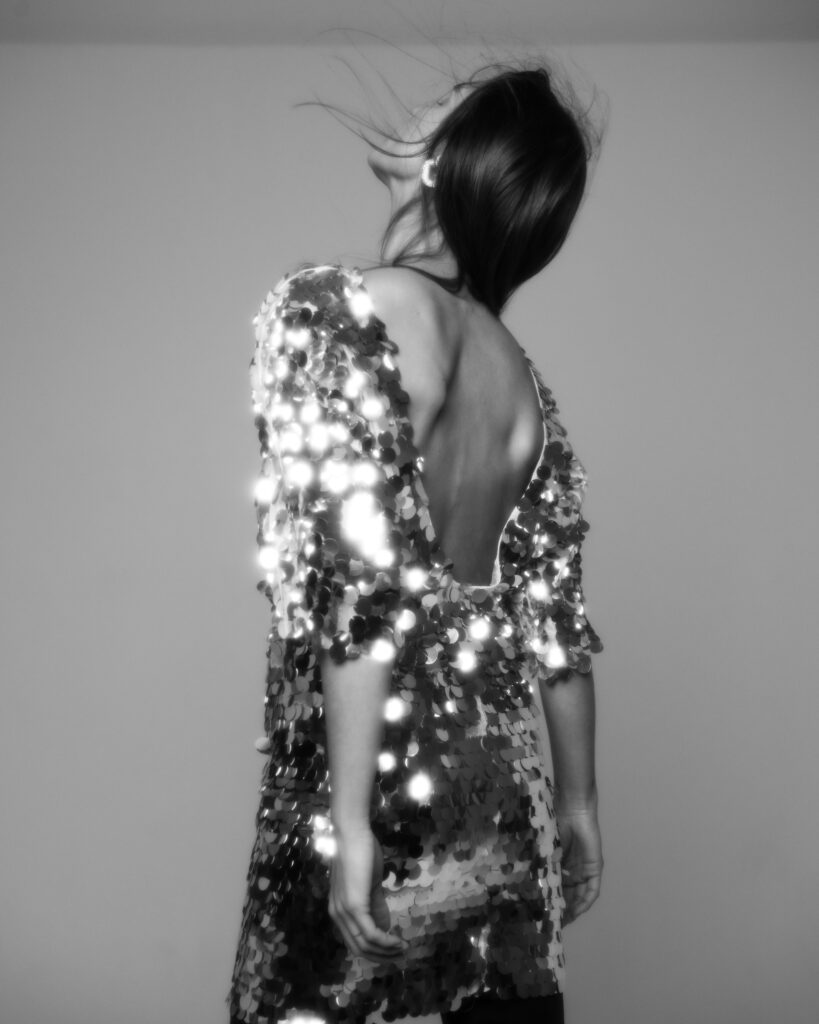 Motywem przewodnim kolekcji „Midnight” jest srebro. Pojawia się ono zarówno w postaci cekinów, jak również błyszczących materiałów o różnych fakturach, dodatkowo wyeksponowane za pomocą marszczeń i drapowań. Efektowna sukienka długości midi z bufkami na ramionach z lejącej tkaniny przywodzi na myśl odważne projekty Yvesa Saint Laurenta z 1991 roku. W srebrze pojawiły się również sukienki i topy z metalicznej dzianiny, która doskonale sprawdziła się na dopasowanych krojach z wycięciami i marszczeniami. Alternatywą dla nich są z kolei cekiny – duże, migoczące w świetle pajetki pokryły marynarkę o oversize’owym kroju (do noszenia również w wydaniu dziennym!) oraz sukienkę eksponującą plecy.