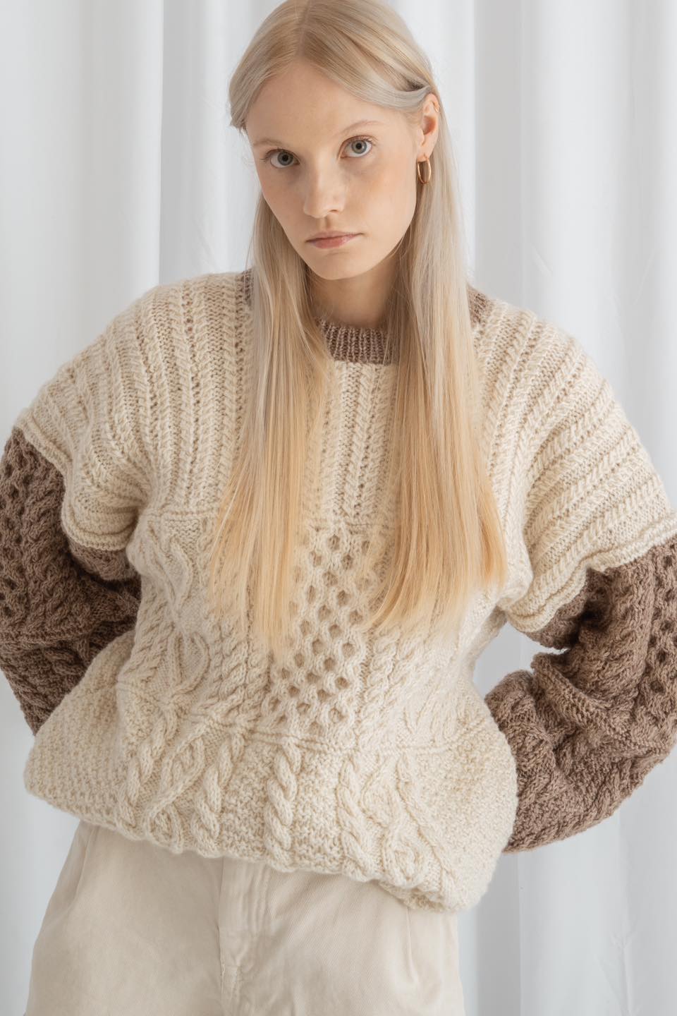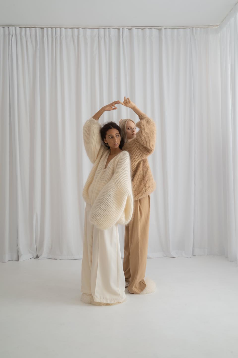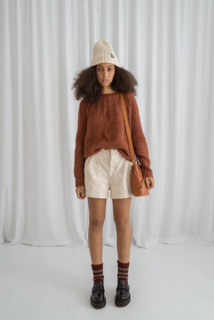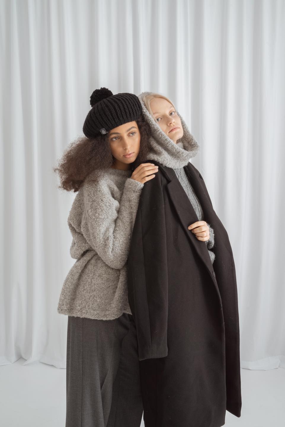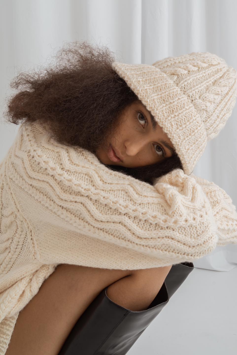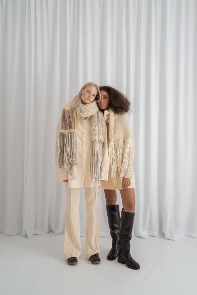 Jesienno-zimową kolekcję uzupełniają akcesoria: wełniane czapki dziergane na wzór bucket hats i turbanów, bonety (lub jak kto woli – balaklawy), długaśne szaliki z frędzlami oraz kominy. Cała sesja, choć dość jak na markę minimalistyczna, bo zrealizowana w całości w studio, doskonale oddaje miękkość i przytulność dzianin, a także prezentuje różne sposoby ich stylizacji. Pomocna jest w tym neutralna paleta kremów, beżów, rdzawych brązów i szarości, ale też i wrażliwość fotografa, który wydobył z dzianin najdrobniejsze szczegóły.