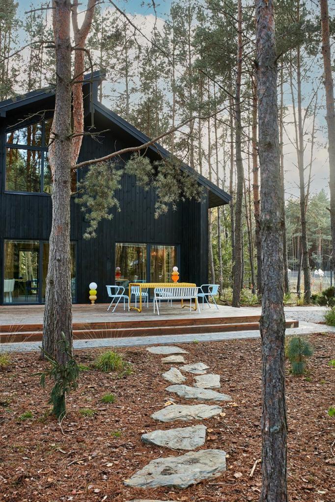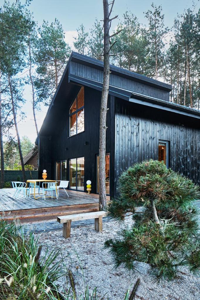 Około godziny jazdy samochodem od Warszawy, w dawnej kolonii letniskowej, na sporej działce wykrojonej z lasu, spośród pachnących sosen wyłania się minimalistyczna bryła. Spadzisty dach, duże panoramiczne okna, czarne deskowanie sprawiają, że jest dyskretna, pasuje do krajobrazu i funkcjonującej nieopodal drewnianej architektury letniskowej z lat siedemdziesiątych. Dom powstał na oryginalnych fundamentach – mówi Joanna Hawrot. Budowaliśmy go z dużym szacunkiem do otoczenia. Mam zmapowane każde drzewo, kamień i zmurszały konar na tej działce. To mój prywatny rezerwat – uśmiecha się. Zaczęliśmy jeszcze w pandemii i jest trochę pamiątką rewolucji, które wtedy we mnie zaszły. Miałam dużą potrzebę stworzenia miejsca, które będzie spotykało wszystkie moje miłości. Tworząc modę, jestem ze swoimi pomysłami blisko skóry osób, które ją noszą, a później wykorzystują jako narzędzie autoekspresji. Hawrot Home miał zadziałać inaczej – chciałam zaprosić gości, by przejęli na chwilę mój filtr na rzeczywistość, stworzyć przestrzeń, która inspiruje i buduje wspólnotę wartości.