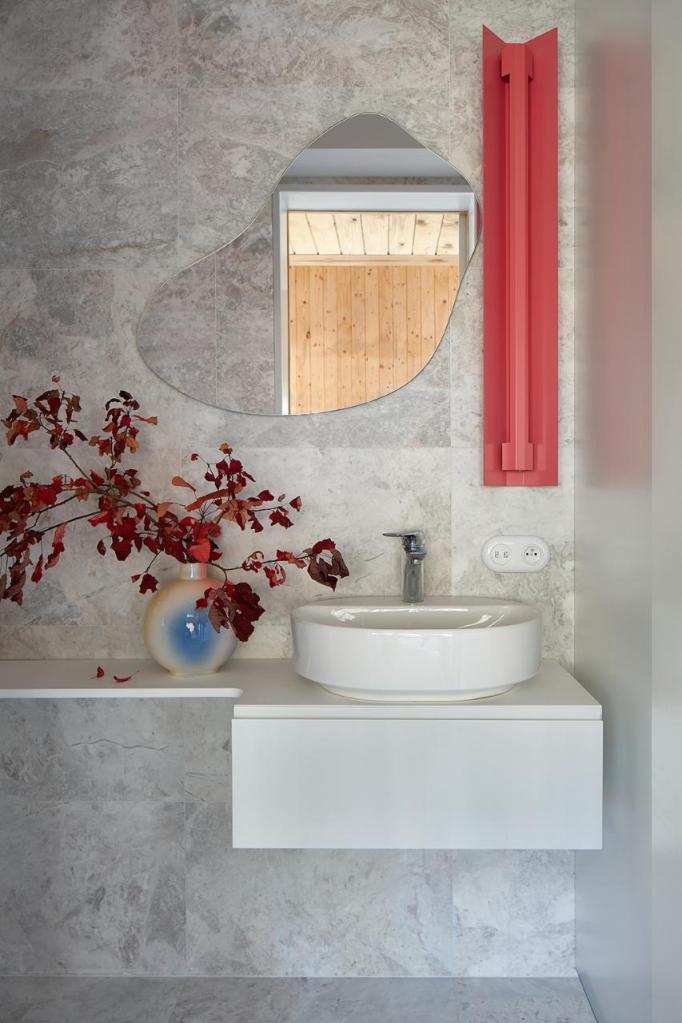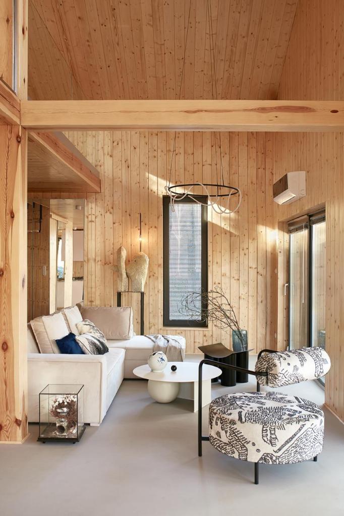Wnętrze Hawrot Home jest kolorystycznym rewersem zewnętrza. Ściany wyłożone surowym drewnem, spokojna paleta kolorystyczna, w której dominuje złamana biel i pudrowy róż, budują spokojną bazę dla głównych bohaterów – sztuki i wzornictwa. Mieszkańcy domu mogą obcować z kunsztownymi porcelanowymi obiektami Wojciecha Ireneusza Sobczyka, czy monumentalnymi rzeźbami Angeliki Markul, artystów reprezentowanych przez warszawską galerię LETO. Chciałam wyjąć sztukę z oficjalnej, galeryjnej, white cube’owej sytuacji i włożyć w ekstremalnie nieformalną, intymną, dziką. Prace rezonują zupełnie inaczej, szybciej, a dzięki temu, że są na wyciągnięcie dłoni, każdy z gości może poczuć, ile rzeczywiście wnoszą do naszego życia. Kooperantów zaproszonych do Hawrot Home jest znaczniej więcej. Znajdziemy w nim charakterystyczne meble z manufaktury The Good Living, listwowe oświetlenie Lexavala, totemiczne lampy Michała Korchowca, szkło Agnieszki Bar, ceramikę Malwiny Konopackiej, porcelanowe wazony mistrzyni kaligrafii Biho Asai, tkaniny ze studia REST, Nomad czy NAP Back to Craft. W wielu projektach (podstawie stolika kawowego, wazonów), nieprzypadkowo powtarza się motyw kuli. Jest on także graficznym symbolem tego miejsca. Bo na Hawrot Home można spojrzeć jak na dzieło totalne i domholistyczny. Planuję otwierać go dla szerokiej publiczności, artystów-rezydentów, zapraszać twórców do realizacji commissions – zapowiada właścicielka. Od początku tej przygody towarzyszy mi filozofia ikigai mówiąca o łączeniu pasji i misji. Mój kosmos przeniosłam tutaj, do lasu i zamierzam się nim dzielić.