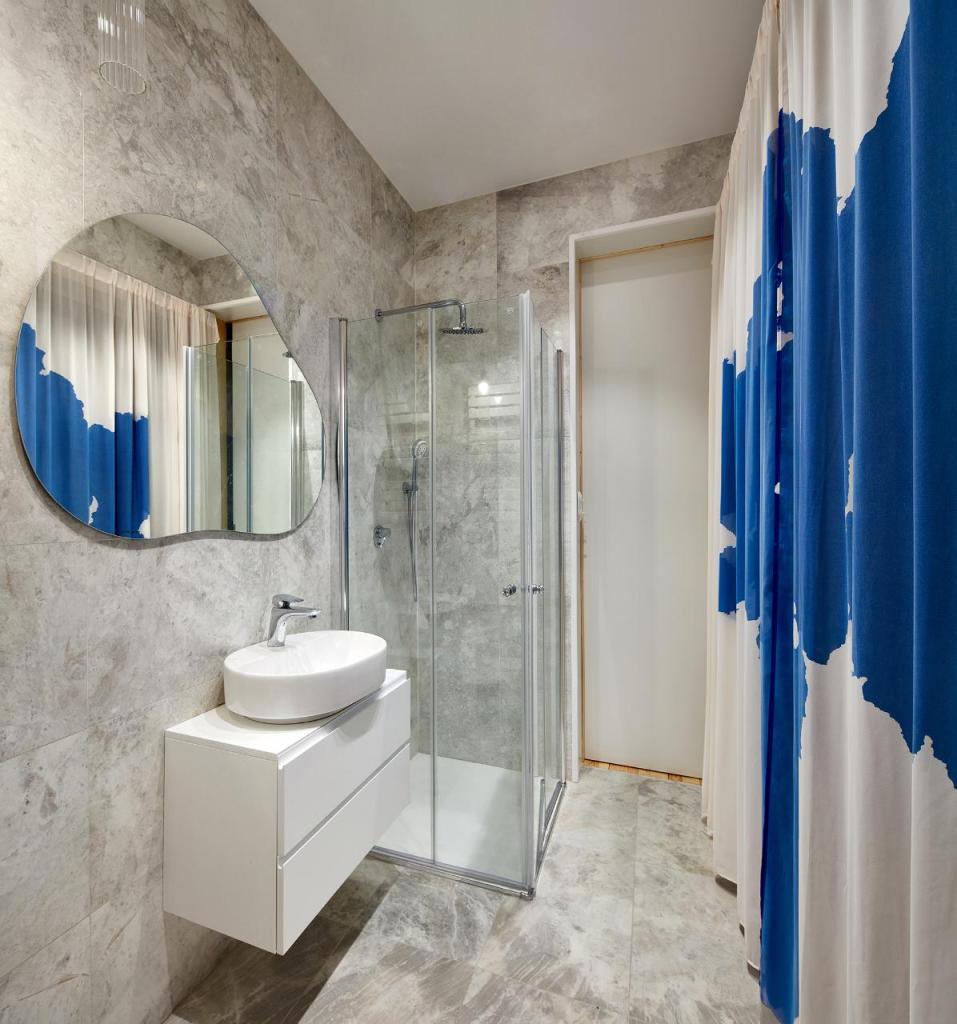 Po wejściu do środka wnętrze zaskakuje brakiem sztywnych granic. Las zagląda do domu, zapraszany przez rozsuwane drzwi tarasowe, ale też kadrowany przez ramy okienne. Z tego powodu nie powiesiliśmy nic na ścianach. Nie chciałam, by obrazy konkurowały z widokiem – dodaje gospodyni. Poszczególne pomieszczenia przepływają jedno w drugie. Parter jest całkowicie otwarty i stanowi salon przechodzący w dużą jadalnię i kuchnię. Pierwsza kondygnacja została zorganizowana na antresoli, wokół zawieszonej nad pierwszym poziomem łazienki. Oddzielona od frontu szklaną ścianą i kotarą jest wspólna dla przylegających do niej z obu stron sypialni. Hawrot Home jest o niwelowaniu barier i bliskości, gotowości otwarcia się – mówi Joanna. Te rozwiązania nie są przypadkowe, choć zdaję sobie sprawę, że nie są dla wszystkich. Kotara, którą zaprojektowałam we współpracy z Angeliką Markul specjalnie do tej przestrzeni nawiązuje do japońskiej tradycji shōji. Może być zasłonięta lub odsłonięta i wtedy, biorąc prysznic, lewitujemy w koronach drzew. Kobaltowy kleks inspirowany testem Rorschacha jest symboliczną zachętą, żeby przyglądać się sobie.